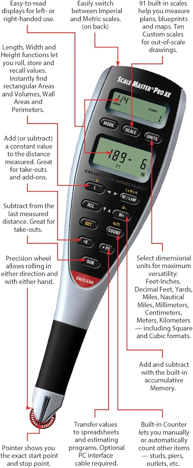 Product Description FAST, ACCURATE DIGITAL TAKEOFFS FOR BUILDING PROFESSIONALS — The Scale Master® Pro XE digital plan measure helps project managers, estimators, and contractors complete linear, area, and volume takeoffs quickly from printed plans, blueprints, drawings, and maps. Ideal for office estimating or jobsite planning. WORKS WITH NEARLY ANY SCALE OR UNIT — Includes 91 built-in scales grouped into Architectural, Engineering, and Civil/Map modes. Easily switch between feet-inch, decimal feet, inches, yards, metric units, acres, and hectares for flexible measuring across projects. ROLL TO MEASURE — INSTANT RESULTS — Capture linear distances, calculate areas by rolling two sides, and add depth or height for volume calculations such as excavation, concrete, or fill estimates. DESIGNED FOR REAL TAKEOFF WORKFLOWS — Features manual counter, Auto-count, Constant (+K), subtract function, scale-lock, and US/Metric mode switching to save time and reduce errors. Optional PC interface cable allows transfer of rolled values to Windows estimating or spreadsheet programs. COMPLETE KIT — Includes protective hard case, User’s Guide, two CR2032 batteries, and Button-cell battery safety-compliant tool-secured battery compartment. Why waste any more time with old fashioned scale rulers or costly “guess-timating”? Click Add to Cart to get your Scale Master Pro XE today! Copyright 2026 Calculated Industries. All rights reserved. From the Manufacturer The newly designed Calculated Industries 6135 Scale Master ProXE gives you simplicity, versatility and accuracy with a new ergonomic design with comfort grip, improved weight balance, dedicated function keys and a new dual LCD display for left- or right-hand use, while maintaining the same award-winning ease-of-use, quality and reliability you expect from a Scale Master. No other plan measure gives you more for less! 91 built-in scales for more versatility. 10 user-set custom scales easily calibrate to out-of-scale plans and plan books. Built-in memories for easy area/volume value storing as well as adding and subtracting of values in memories. More dimensional units and dedicated function keys ease use. The Scale Master ProXE is PC compatible and can be upgraded at a later point in time with P No. 5006 Scale Master ProXE Plug-and-Play PC Interface cable or purchase the combo unit P No. 6335. Comes with a 1-year warranty.