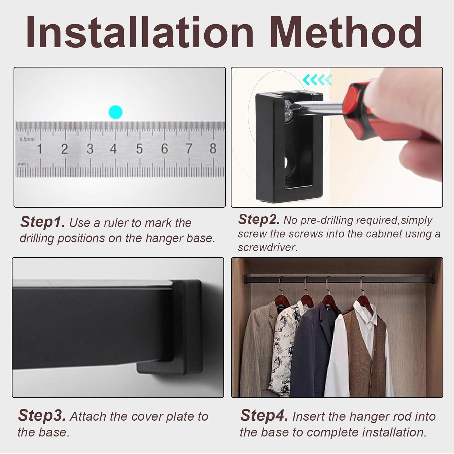 Closet Rod Top Mount Wardrobe Bars:Are you tired of dealing with a disorganized closet? Frustrated with flimsy hangers that just can't hold your clothes? Our premium closet rod is designed to enhance your storage experience. With a robust construction, it ensures that your garments stay securely in place, eliminating sagging even with the heaviest items. Transform your cluttered space into an organized haven and enjoy a seamless dressing experience. **Package Includes:** - 1 x Closet Rod - 2 x Flange - 4 x Screws **Specifications:** - Clothes Rail Length: Adjustable from 50-160cm (19 5/8-63in) - Clothes Rail Thickness: 1.5mm - Available Colors: Black, Silver, Champagne **Installation Note:** - To determine the required rod length, measure the internal width of your wardrobe and subtract 1cm (to account for flange base thickness). **Product Features:** - The sleek metallic finish integrates beautifully with your home decor, adding a modern touch to any space. - Complete installation accessories are included for a hassle-free setup, making it easy for anyone to install without prior experience. - Designed with a strong load capacity, it effortlessly supports heavy winter garments without bending or warping. - The anodized finish provides a smooth surface, allowing for easy sliding and quick access to your clothing. - Versatile functionality allows it to serve as both a clothes hanger rod and a curtain rod, catering to various home needs. **Important Tips:** - Please note that handmade measurements may result in slight variations. - Actual product colors may differ slightly due to differences in screen displays. - Be sure to measure the required length accurately before making your purchase. Elevate your storage solutions with our durable closet rod and enjoy a more organized and stylish living space!