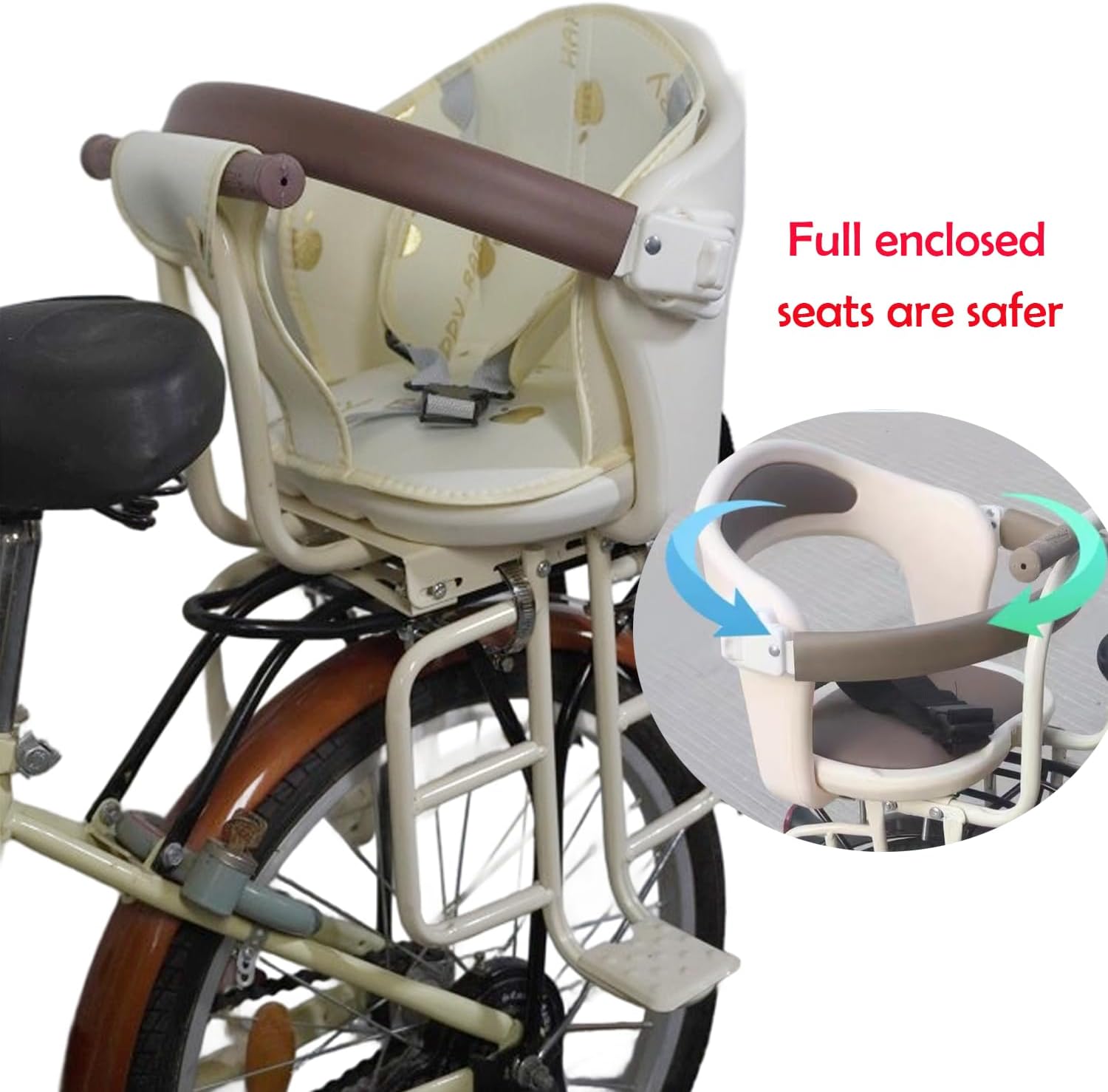 This child bike seat attachment for adult bike has a handles ,guardrail handrails,breathable thicker seat cushion and backrest and footrests.Your child's feet can rest comfortably on the pedals, and the thick cushion is soft and breathable.Make sure to enjoy the ride with your child in comfortable conditions.