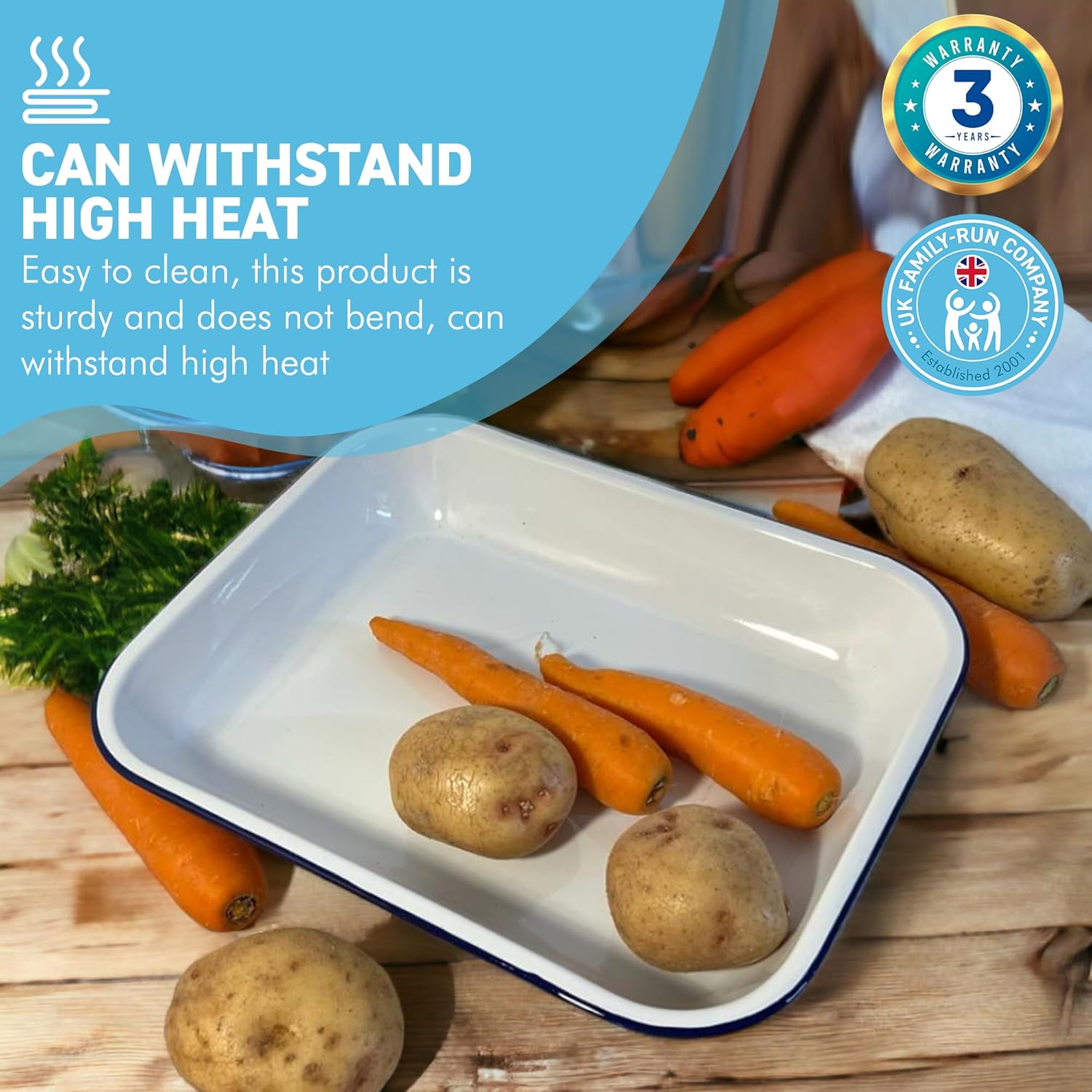 This STURDY ENAMEL BAKEPAN DISH is suitable for all occasions. The vitreous, double coated enamel helps the dish to resist stains and scratches and improves the overall product durability. It is multi-functional in the kitchen and can be used in the oven and is safe to freeze foods in. Bring TRADITIONAL STYLE TO YOUR TABLE with this classic white and blue enamel pie dish, provides a stylish and rustic retro addition to food and table presentation combining functionality with usability making the dish ideal for commercial and home use. These dishes are PERFECT FOR PICNICS OR CAMPING, they also make a stylish means of serving up cakes, puddings, cold meats, sandwiches, roast potatoes and much more, they are perfect for baking and browning, these classic dishes will provide an al fresco edge to pastries, potpies, pasta bakes and more Measures. 34cm (L) X 28cm (W ) X 5cm (D) | 13inches (L) X 11 inches (W) X 2 inches (D) EASY TO CLEAN, the pie dish cleans easily, either in the dishwasher or with a bit of soaking in hot soapy water and the wide rims allow a confident grip. Ideal Dish for BAKING PIES and BAKING SHEPHERDS’ PIES, MEAT PIES and PUDDING etc, completely oven safe up to 520oF (270oC), dishwasher proof, can be used on Electric and Gas hobs but prime use is in the oven.