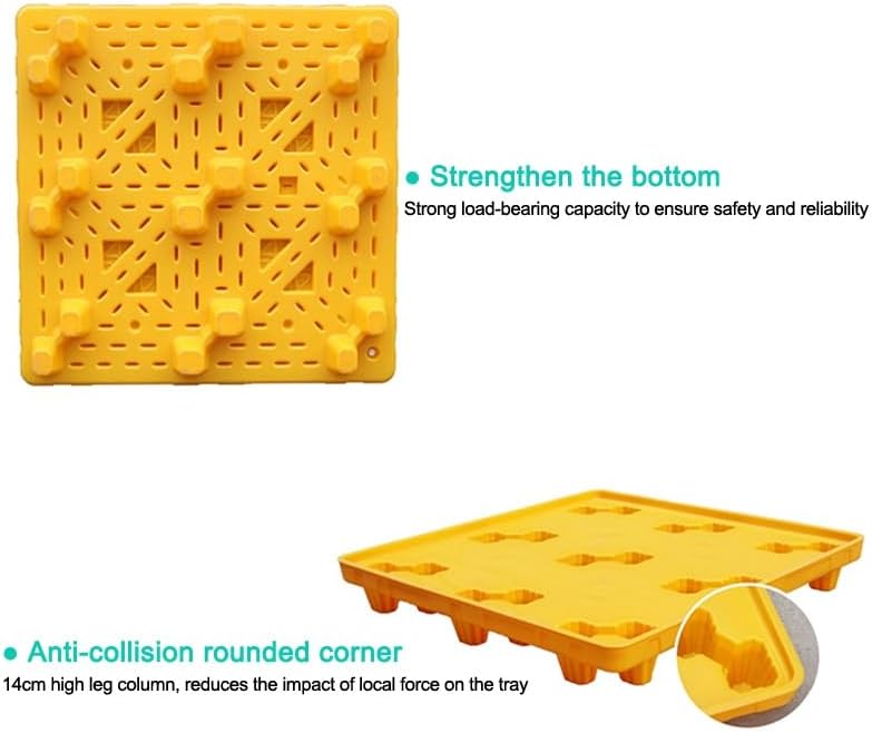 "HAIPENG" STORE INTRODUCTION:Our store mainly sells furniture, bedside cushions, clothing display racks, mannequin bases, outdoor sunshades, niches, and mannequinsFeatures:The top grates of this spill platform are removable for easy cleaning, while forklift pockets make relocation easyThis spill containment platform provides ample space and overflow capacity, reducing the spills and keeping the ground cleanSpecifications:Name: Containment Spill Pallet/Low Profile Spill Containment PalletQuantity:1Color: YellowMaterial: PolyethyleneWeight: 6kgProduct size (L x W x H): 65x65x17cm , 125x65x17cmEasy to clean: Rinse with clean waterPackage includes:1/3/5 x Pallet