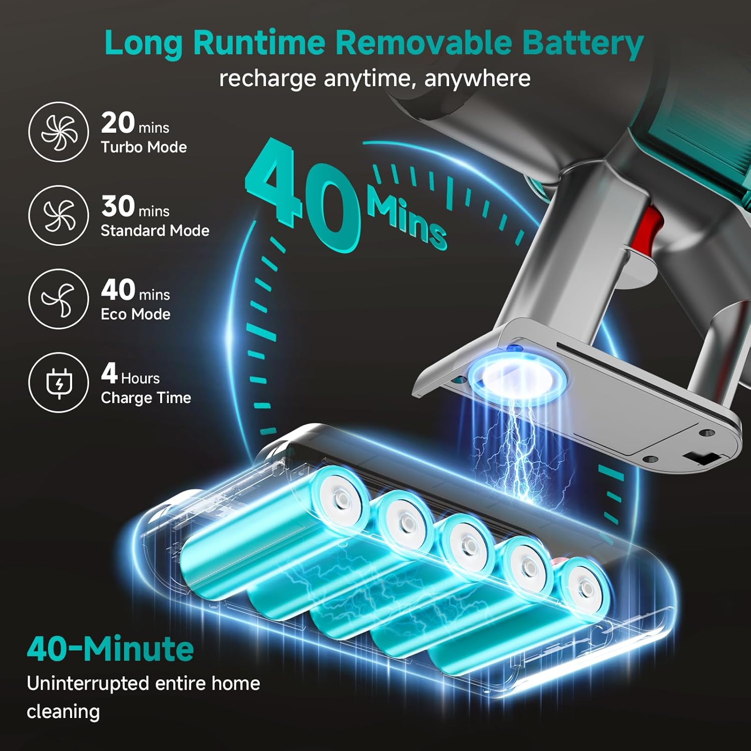 | Other Special Features of the Product | 3 Suction Modes/ 6-IN-1 Rechargeable Vacuum/ Adjustable Angle/ Large-Capacity Dust Cup/ Detachable Battery/ Self-Standing/ Portable/ LED Headlights/ Large Capacity Dust Cup/Washable Filter |