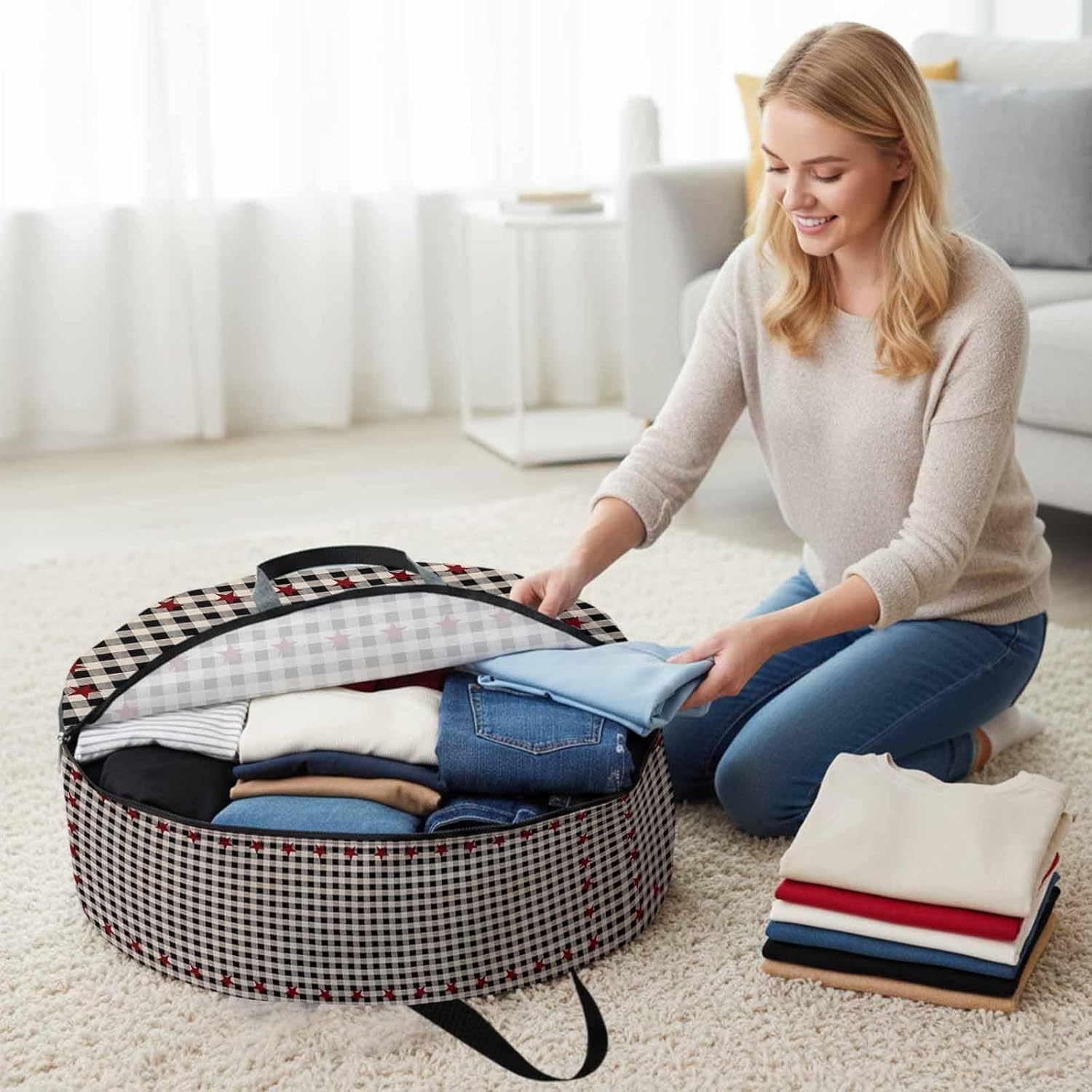 Reclaim Your Closet Space with the Round Storage Solution! Material: polyester Diameters: 24 inch, 30 inch, 36 inch Depth: 7 inches Package Includes: Round Storage Bag One Bag, Endless Possibilities: Whether you are swapping out your summer wardrobe, moving into a new dorm, or packing away holiday decorations, this bag has you covered. The circular design is uniquely suited for: Bedding: Comforters, quilts, sheet sets, and oversized pillows. Clothing: Winter coats, sweaters, and bulky ski gear. Home Decor: Holiday wreaths, garlands, and floral arrangements. Outdoor Gear: Camping blankets, sleeping bags, and beach towels. Dual Zippers: The high quality double zipper design allows the closet organizer to open wide from both sides, making it effortless to load and unload even the bulkiest comforters or wreaths. Reinforced Handles: Sturdy, reinforced handles are securely stitched to provide extra strength and a comfortable grip when carrying heavy loads or pulling the bag from under a bed. Clear Label Pocket: A transparent built-in label holder allows you to quickly identify the contents of each bag without ever having to unzip it, keeping your storage perfectly organized.