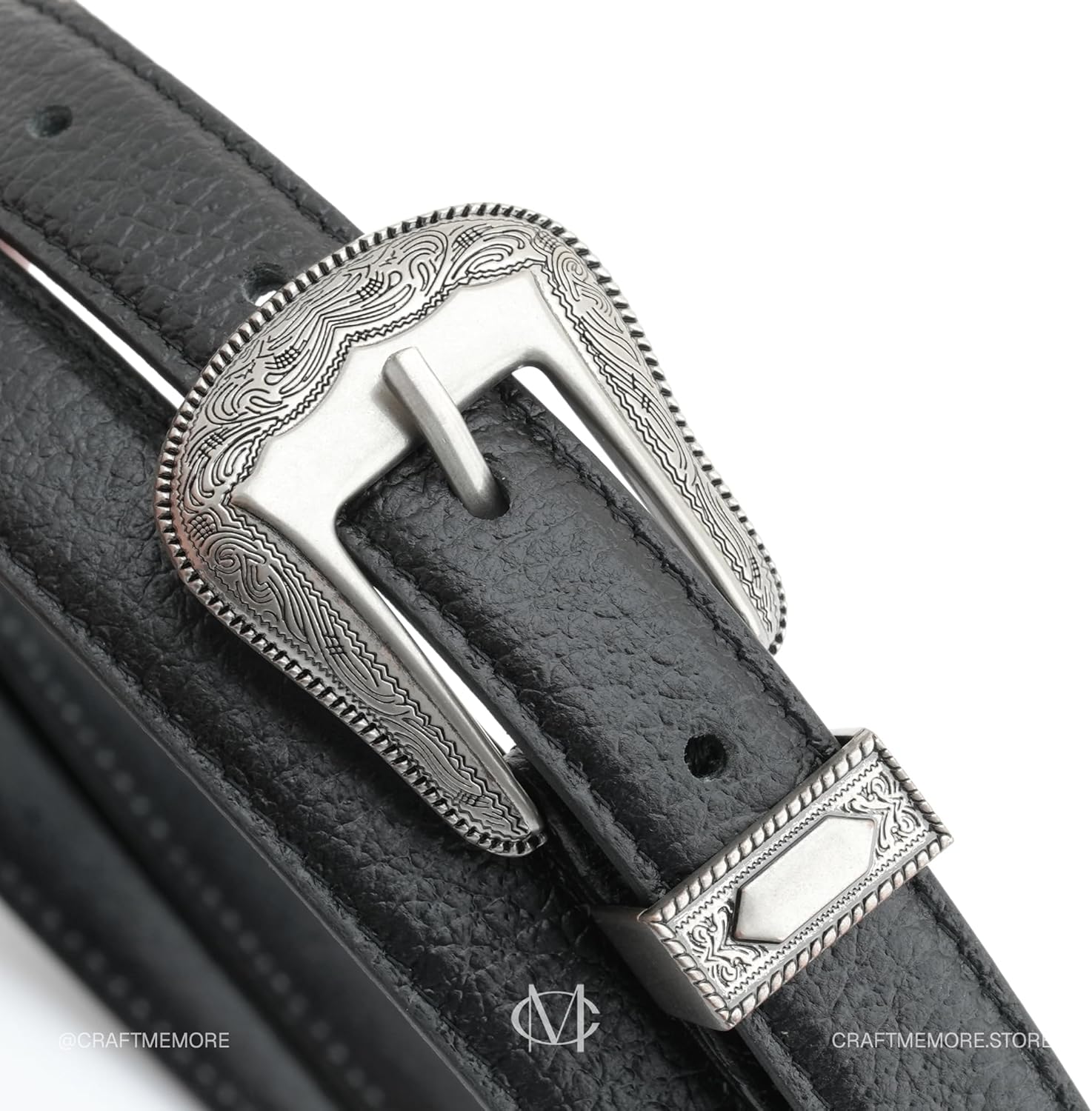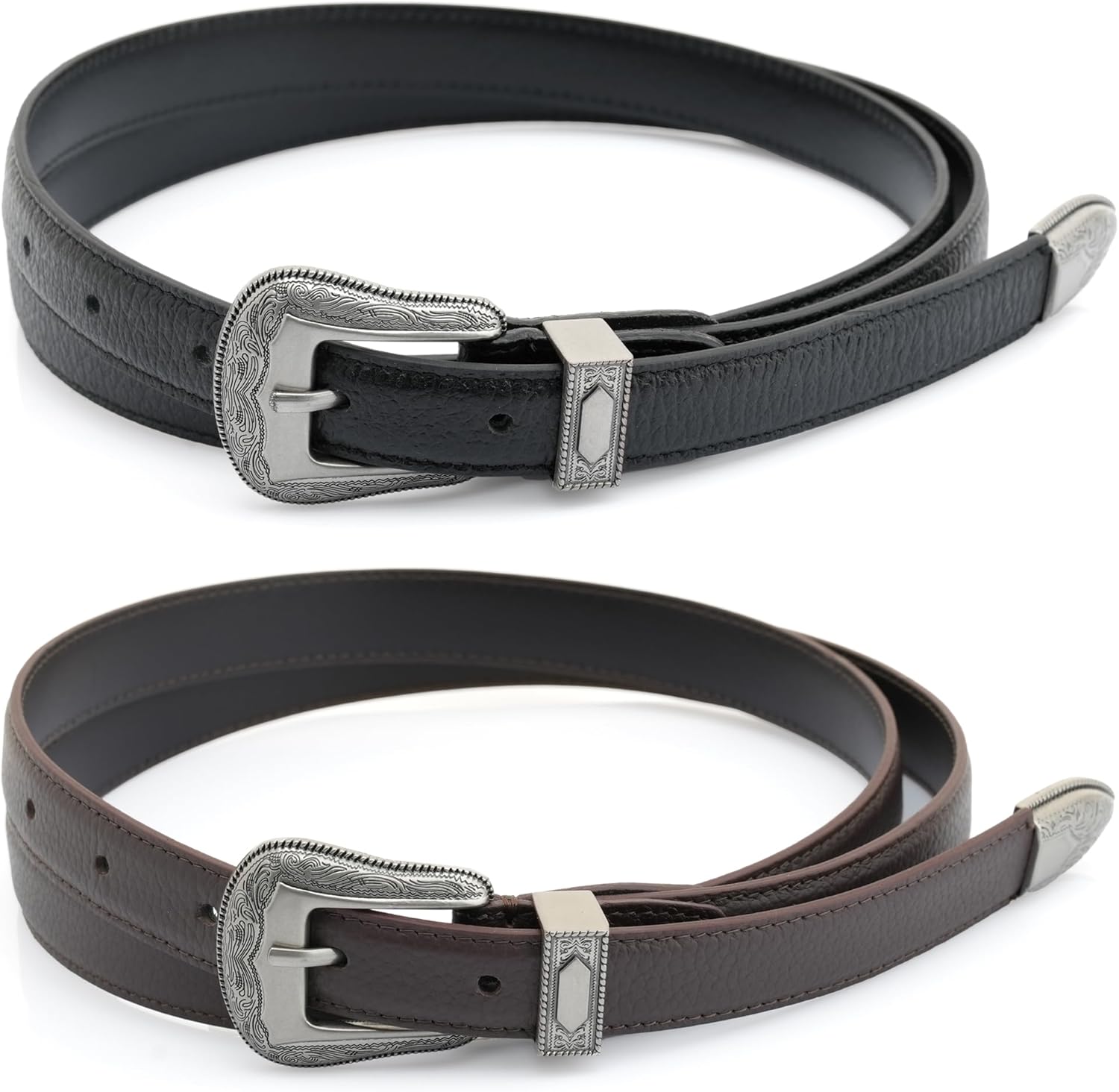 Elevate your style with this sophisticated 3/4-inch Western leather belt that perfectly balances classic charm with modern minimalism. Crafted from premium pebble grain cowhide, this CRAFTMEMORE belt offers a refined texture and exceptional durability for daily wear. The slim profile makes it versatile enough to complement both casual denim and formal attire. Featured with an intricately engraved black-oxidized buckle and tip, the belt showcases meticulous attention to detail in its Western-inspired design. Measuring approximately 47.2 inches in total length, it's ideally sized to fit waists between 33-36 inches, with the center hole accommodating a 35-inch waist. The handcrafted Thai construction ensures superior quality, while the distinctive pebble grain texture adds subtle sophistication to your wardrobe. Each belt comes presented in a signature box, making it an excellent choice for both personal use and gifting. The perfect blend of functionality and style, this belt proves that Western accessories can be both refined and contemporary.