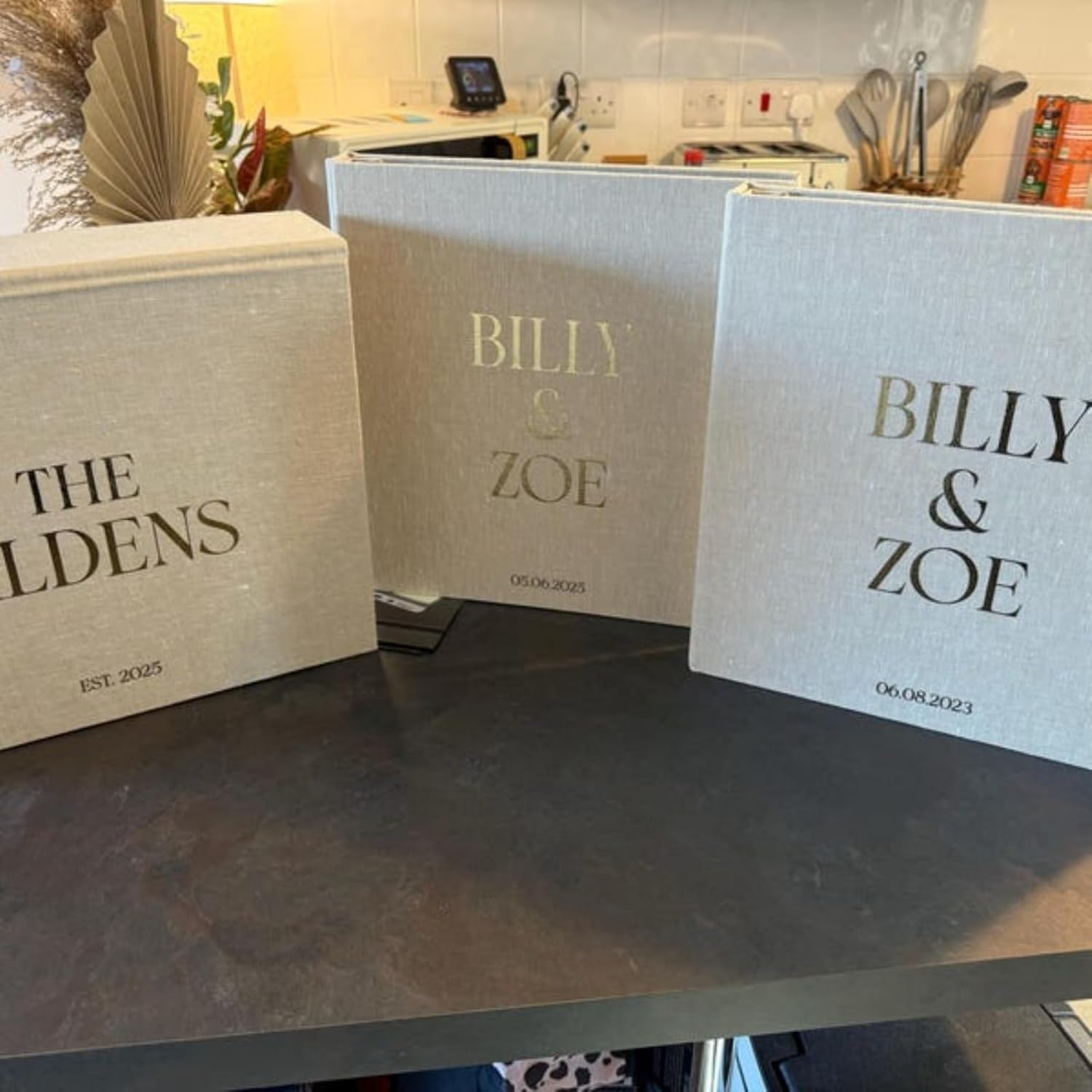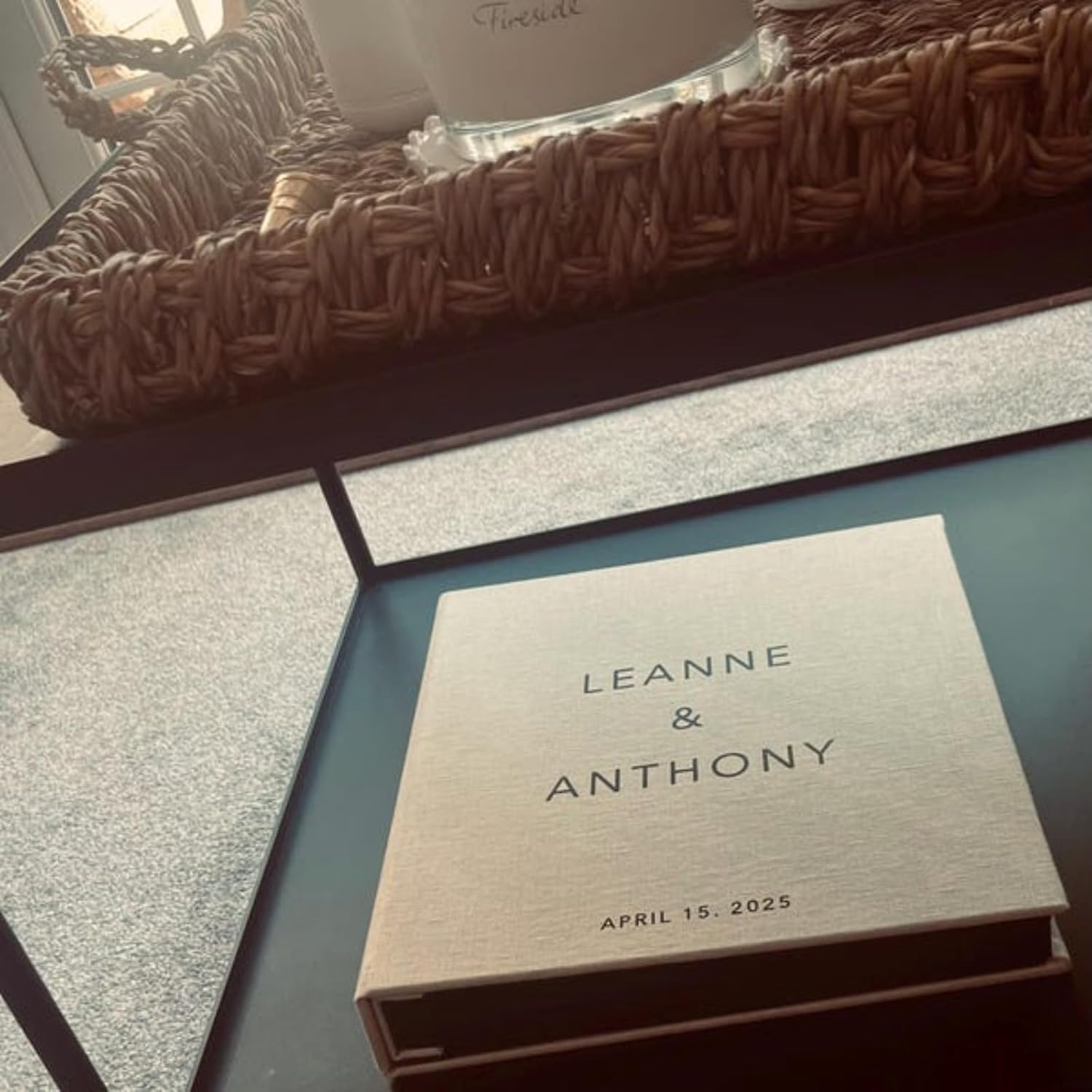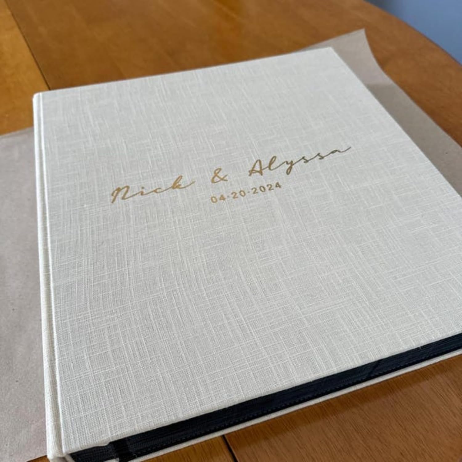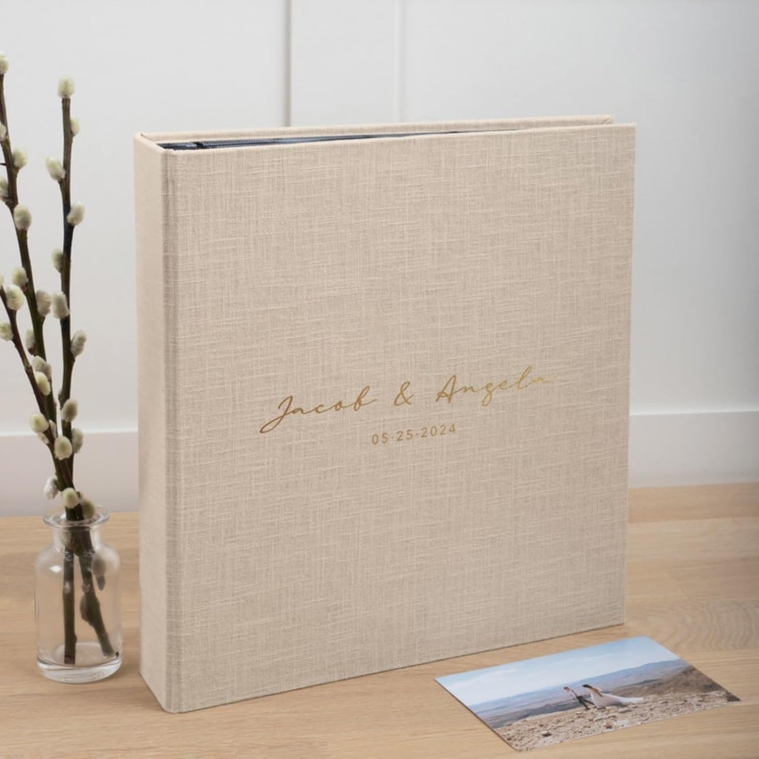 Treasure Your Special Day with Our Slip In Wedding Photo Book Preserve your cherished memories in timeless style with our handcrafted Slip In Photo Album. Each album is meticulously crafted to ensure your photos are elegantly stored and protected for generations to come. Key Features: 100% Natural Linen, Velvet or Cotton Cover: Crafted with high-quality linen for a classic and timeless look. Make your wedding moments truly unforgettable with Linen Albums and create a family heirloom that encapsulates the essence of your celebration. Pictured Product Details: Album Color: Sail cloth Album Size: 12.4 x 13.2" Album holds 20 pages|100 photos 4x6" photos Writing Font: #5 Writing Color: Gold foil Please note: Personalization is made using a high-quality heated sticker.