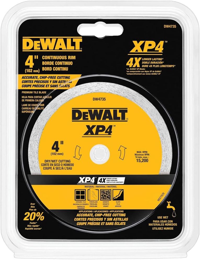 Product Description DEWALT DW4735 4IN PORCELAIN TILE BLADE From the Manufacturer DEWALT Extended Performance Tile blades have a diamond matrix that provides long life and enhanced material cutting. These blades are ideal for cutting all types of stone and tile. They have a continuous rim design that provides chip free cutting in all types of tile and cuts 20% faster than a standard tile blade. XP4 blades are designed specifically for high power tile saws, allowing quick, free, low heat, and straight cutting Premium XP4 cutting matrix gives 4x's the life of standard blades.