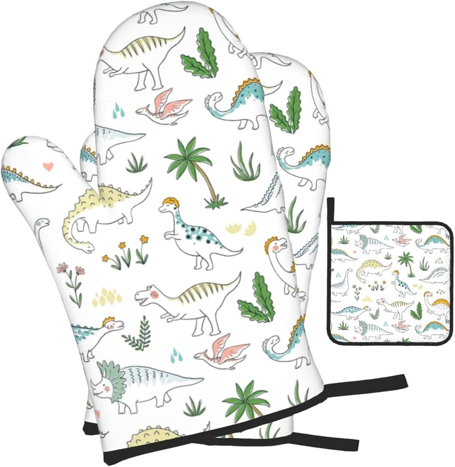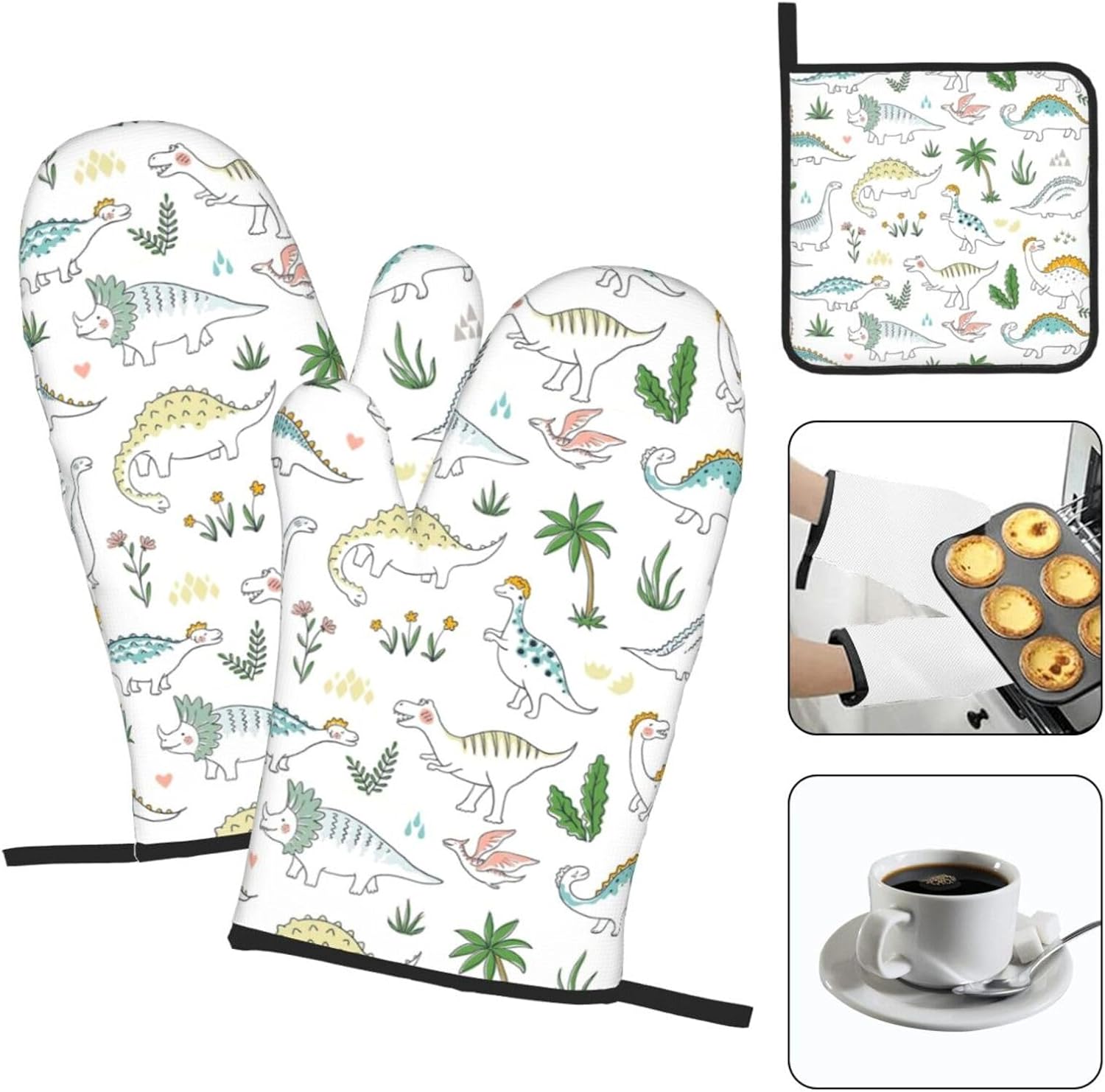 upgrade your kitchen safety with this Dinosaur Walking print microwave gloves, oven mitts and pot holders sets. crafted from water repellency polyester and heat-resistant fabric, these kitchen baking three piece set offers reliable protection for hands while handling hot items. the double-layer waterproof design ensures easy cleaning after use. suitable for various cooking scenarios including microwave ovens, conventional ovens, stovetop cooking, and outdoor grilling. the side hanging rope allows convenient storage when not in use. the thick construction provides excellent heat insulation without compromising dexterity. this unisex kitchen essential combines functionality with practical design for everyday cooking needs. the heat-resistant gloves maintain comfort while offering superior protection against burns. an essential addition to any modern kitchen setup