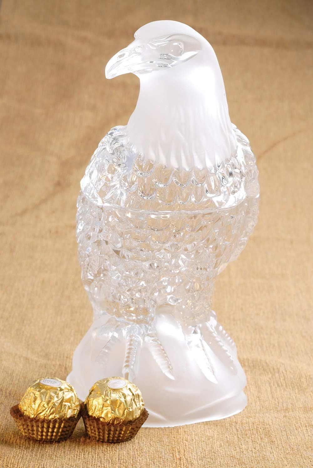 Enrich your home with a spectacular lead crystal glass eagle jar, Polish or American that is functional as well as decorative. The crystal hand-etching and hand-cutting techniques used to define the life-like features of the eagle characterize its magnificent beauty. The upper part of the eagle is a lid while the lower half is the container. Lead crystal is a popular gift for weddings, anniversaries, graduations, and baby showers. A crystal piece is usually so treasured in households that the keepsake is passed from generation to generation. 24% Lead Crystal Measures approx. 5.5"L x 4.5"W x 9.25"H Made in Poland To decrease the risks associated with eating and drinking from lead crystal, constantly store food and beverages in lead-free containers and immediately transfer them to the crystal item right before serving. New crystal can be soaked in vinegar for 24 hours before use, then hand washed with mild detergent, and thoroughly rinsed in lukewarm water. Since the danger of lead exposure is more prominent for children and pregnant women, it is best to abstain the usage of lead crystal for these groups.