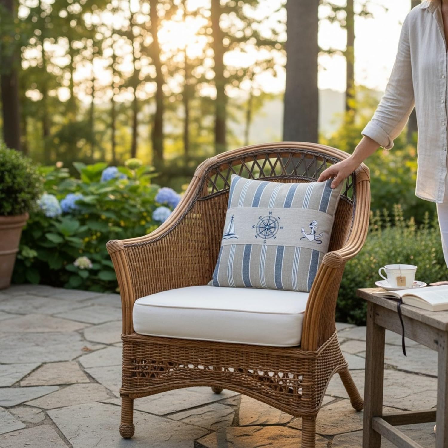 Nautical throw pillow cover size 16 inch x 16 inch featuring 3 embroidered sailing designs in the centre of the cover. The 100% quality cotton fabric color is natural beige with blue and white stripes and the back of the cover is striped and features a hidden zipper. Create a nautical theme with this coastal cushion cover which is also machine washable.