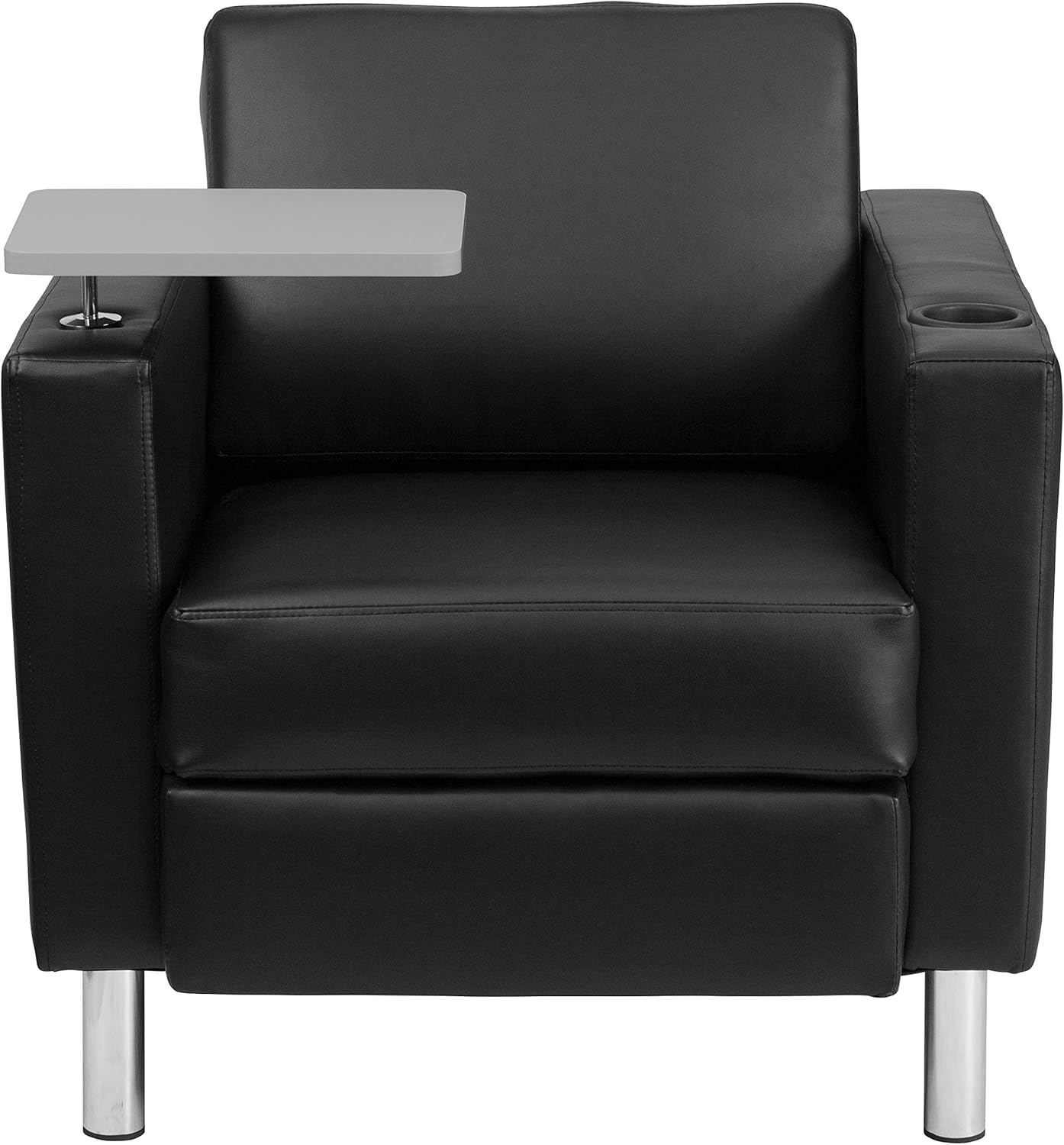 Welcome your visitors and colleagues with this black LeatherSoft guest chair with tablet arm. The chair has a plush seat with 3" of foam and features a tablet arm for working on a laptop or completing paperwork. The tablet arm swings a full 360 degrees to position it at the ideal angle. Two interchangeable rods easily adjust its height between 2.25" and 3.25" above the chair's arm. Simply lift the tablet and rod out of the spring-loaded recessed hole, unscrew and replace the rod, and set it back into the hole. A built-in cup holder keeps hands free for writing or typing while minimizing the possibility for spills. Sturdy, tall chrome legs are capped with plastic floor glides to protect your floor by sliding smoothly when you move it. Whether you're creating a dedicated study space for a college or library or a productive space for visitors to wait, this attractive chair is an excellent choice.