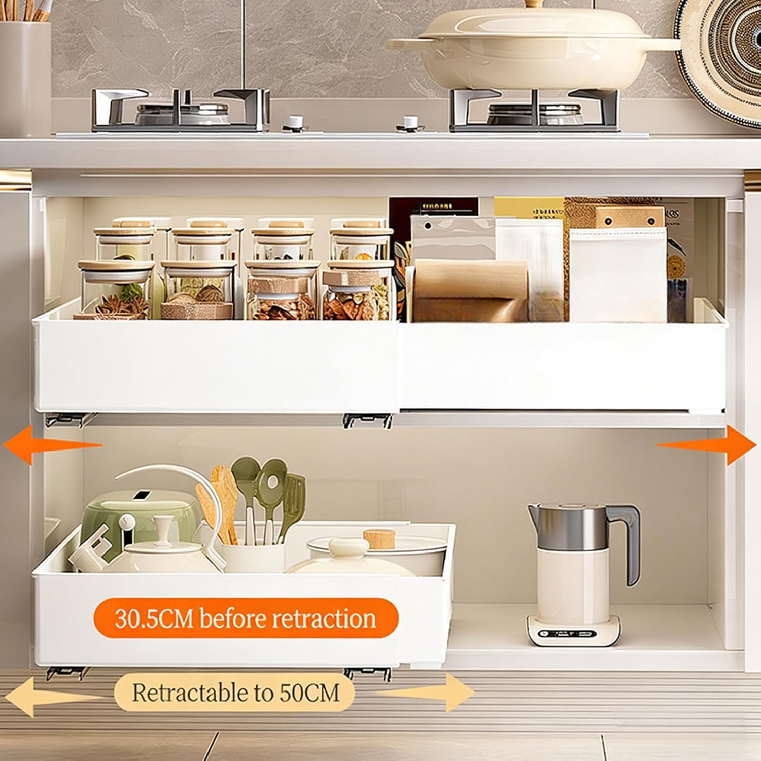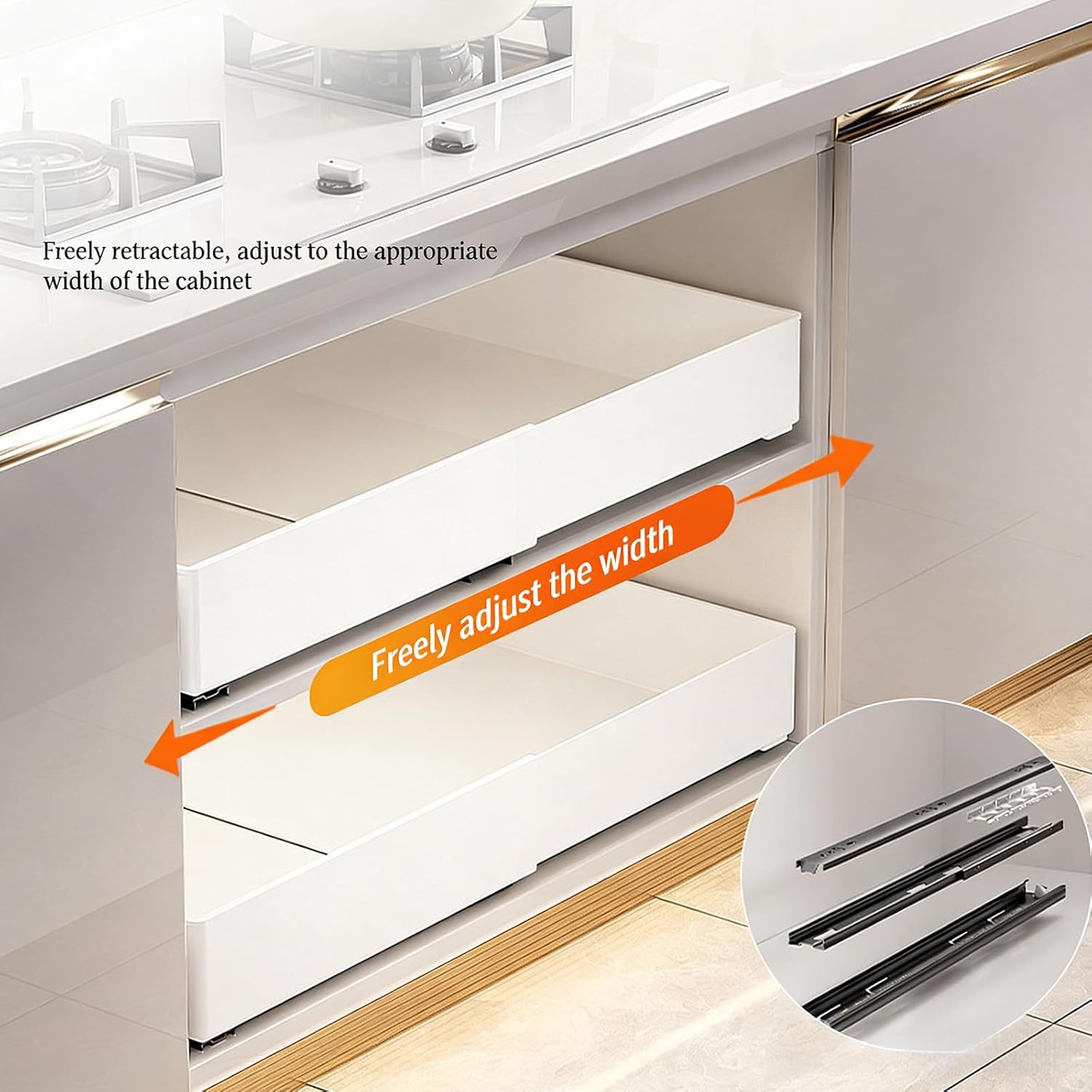 Expandable Under Sink Shelf Storage Adjustable Length For Cabinet Drawer Efficient Space Utilization Features: Flexible Size Feature: This cabinet drawer shelf provides adjustable width from 30.5cm to 58cm, accommodating various cabinet sizes for individualized organization needs Sturdy Construction: Crafted from resilient that resists deformation, and humidity, making it ideal for damp bathroom environments The lightweight yet strong build ensures lasting tool less Quick Assembly: Simple to install within moments without needing tools or hardware, for renters and those who prefer effortless setup The straightforward installation saves time and effort Organized Multi Section Design: Features multiple compartments to neatly store bathroom necessities like toiletries and supplies Household Friendly Materials: Manufactured using that ' s gentle for daily use around the home The consistent construction makes it appropriate for family environments with Specifications: Substance: Process: High precisions shot molding Size: before telescopic size: 30.5x41.4x7cm; after telescopic size: 58x41.4x7cm; telescopic design, suitable for different sizes of cabinet interior spaces Practicality: Maximizes the use of vertical space in the cabinet to facilitate access to items, suitable for use in various home environments such as kitchens and bathrooms Package Includes: Retractable cabinet ×1 Note: Before using the accessory, please check if it is compatible Pay attention to the storage methods