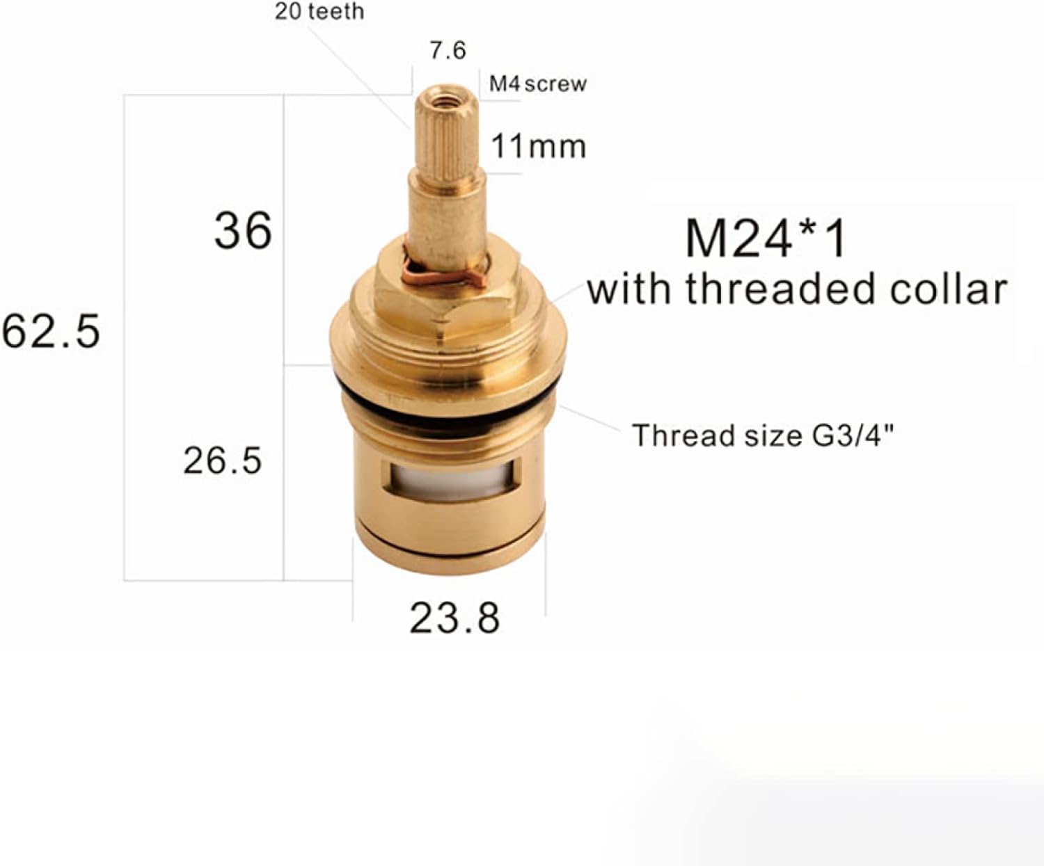 Ball ValvesWarmly Tips:1. Please check the dimensions carefully before ordering to ensure compatibility with your model.2. Determine whether the opening direction is clockwise or counterclockwise.Specifications:Material: brass ceramicSpline diameter: 7.6 mmTeeth on the spline: 20 teethThread size: G3/4Threaded collar: With a threaded collarSize: 23.8mm x 62.5mm(Please view the picture for detail dimensions)Product color: blue red (Optional)Product material: brassInstall the replacement1. Lever the lid of the faucet handle with a knife2. Loosen the screw with a screwdriver3. Remove the screw4. Remove the faucet handle5. Screw off the old cartridge with a wrench6. Remove the old faucet valve and install the replacementProduct Service:If you have any questions after receiving the goods please contact us with email we will give you a satisfactory response within 24 hours.