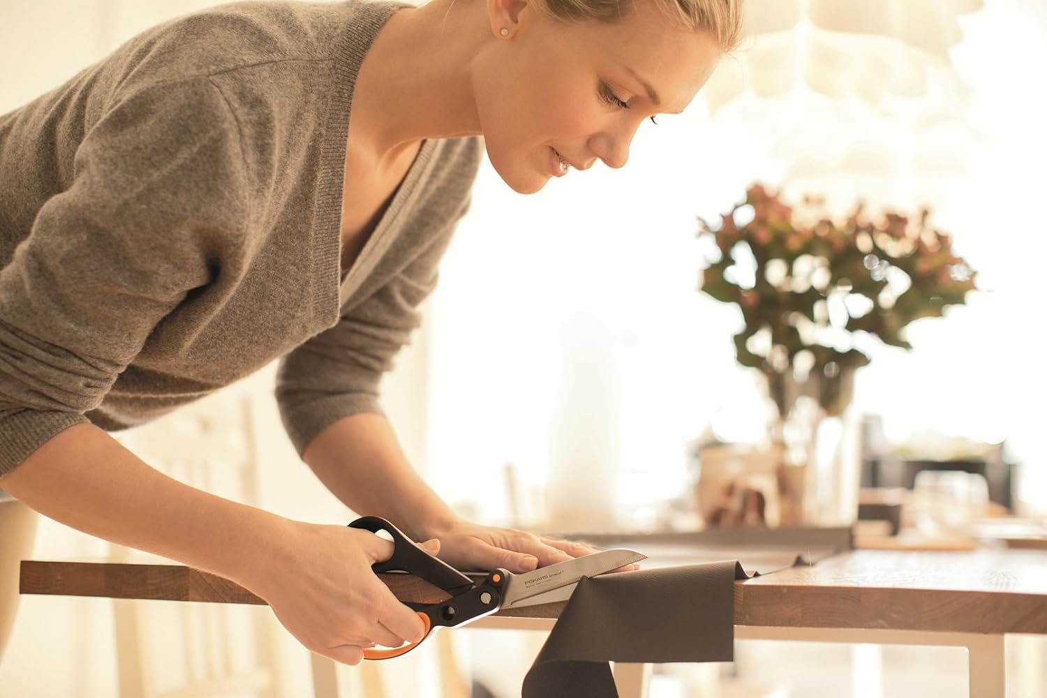 Universal scissors with special serrated edge for cutting very thick materials such as fabric, carpeting, and cork, Suitable for right-handed users, Amplify technology for double the cutting power and less effort, Sharp and sharp stainless steel serrated blades for optimum results, Pleasant grip and firm hold thanks to ergonomically shaped handles made of high-quality plastic, Finger loop with non-slip surface, High durability of quality steel and glass-fibre reinforced plastic, easy cleaning - dishwasher safe , Contents: 1x Fiskars Amplify Hardware Scissors, Total Length: 24 cm, Weight: 166 g, Material: Stainless steel/plastic, Colour: Black/Orange, 1020223