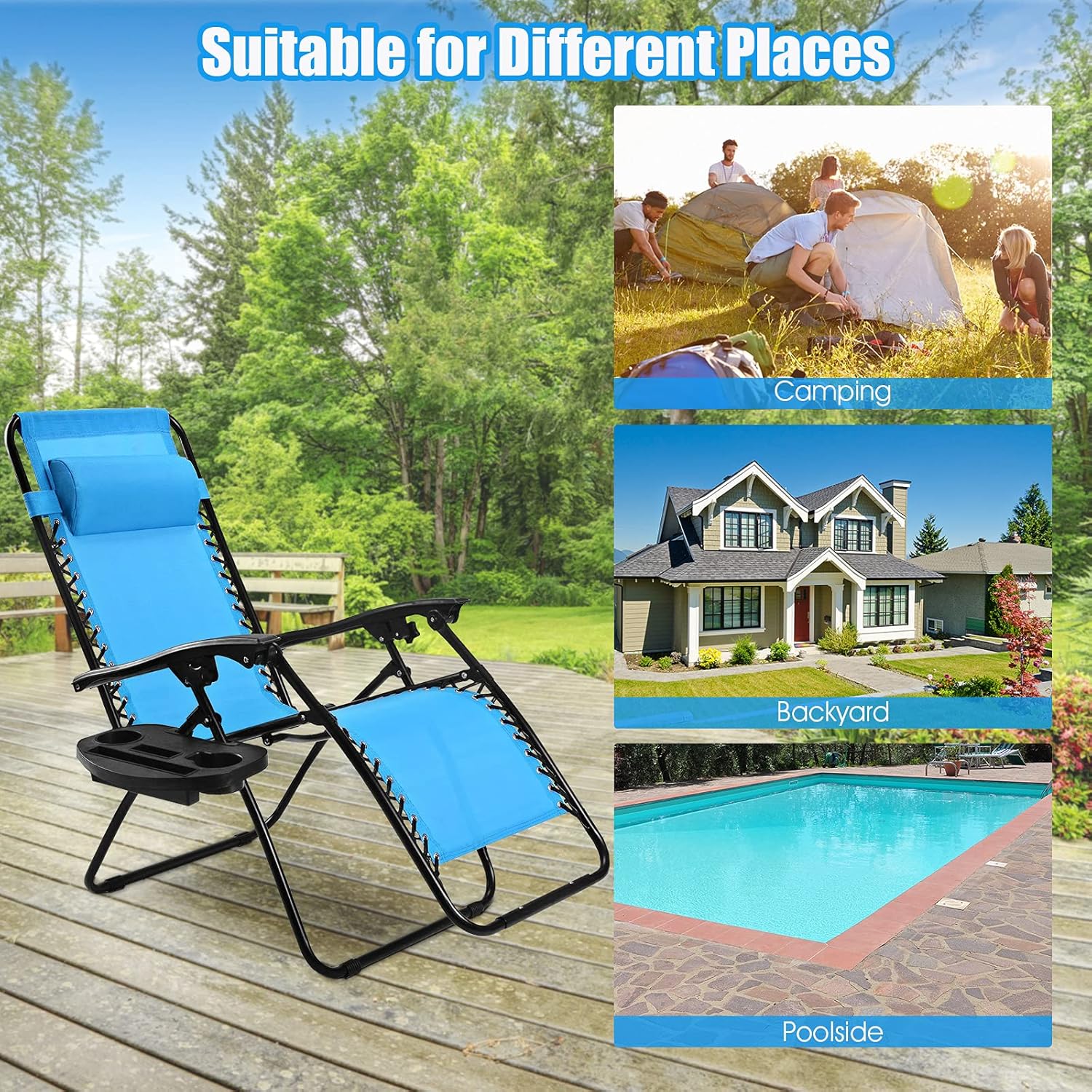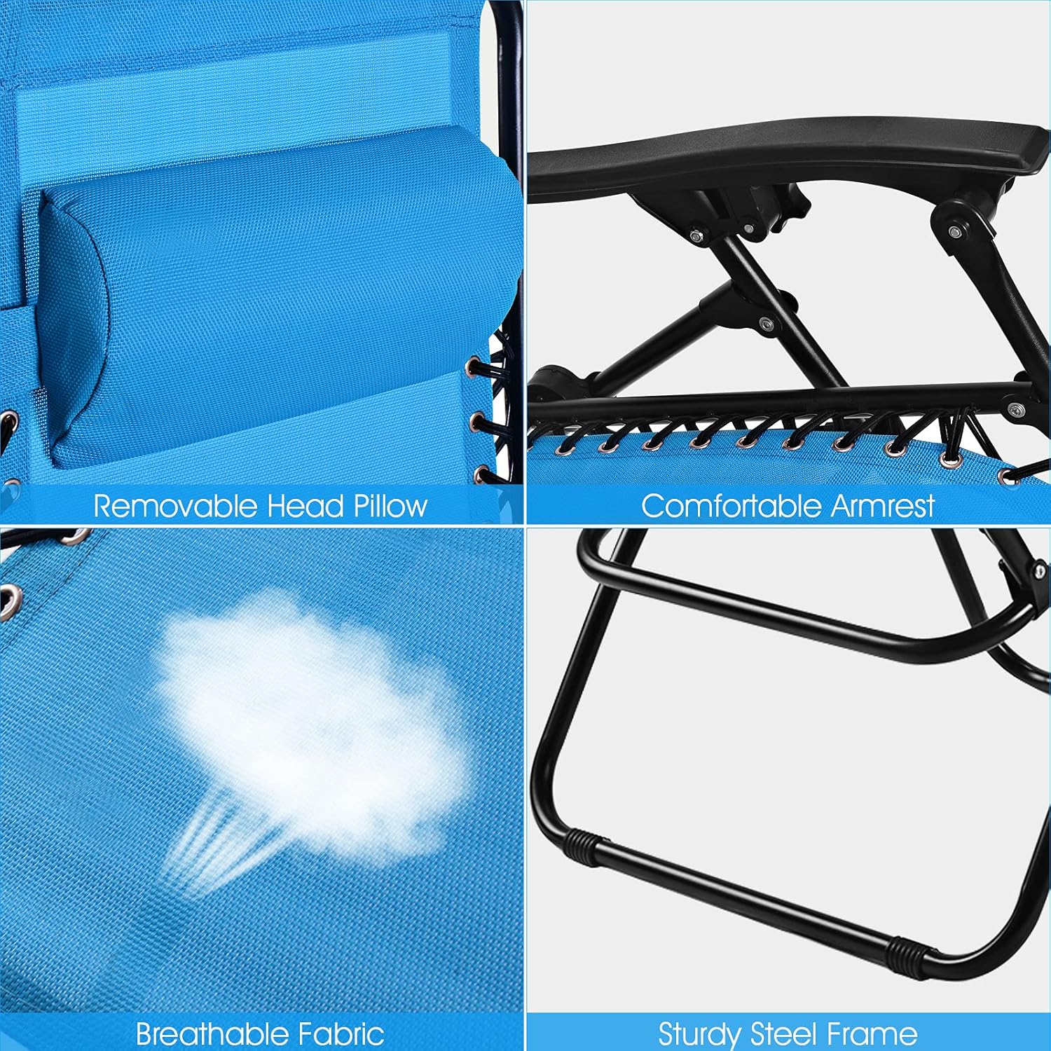 Description:Cup Holder - A cup holder tray to place beverage, magazine, phone or other small items for convenient accessibility.Folding Design - For easy stacking and storage, this gravity chair can be folded into one third. And it is lightweight, which can be easily moved from room to room.Detachable Headrest - A detachable headrest for better lounge experience. Due to its detachable design, it is convenient to clean and wash.Durable Reinforcement - Double fabric with steel cross bar makes it reinforcement. It can hold up to 250-lb, and 26-inch width is suitable for users.Specifications:Color: BlueMaterial: Textilene, PlasticOpen Size: 35.4" x 25.2" x 43.3"(L x W x H)Folding Size: 36.2" x 25.0" x 5.1"(L x W x H)Net Weight: 30lbsWeight capacity: 300lbsPackage Include:1 x Lounge Chair