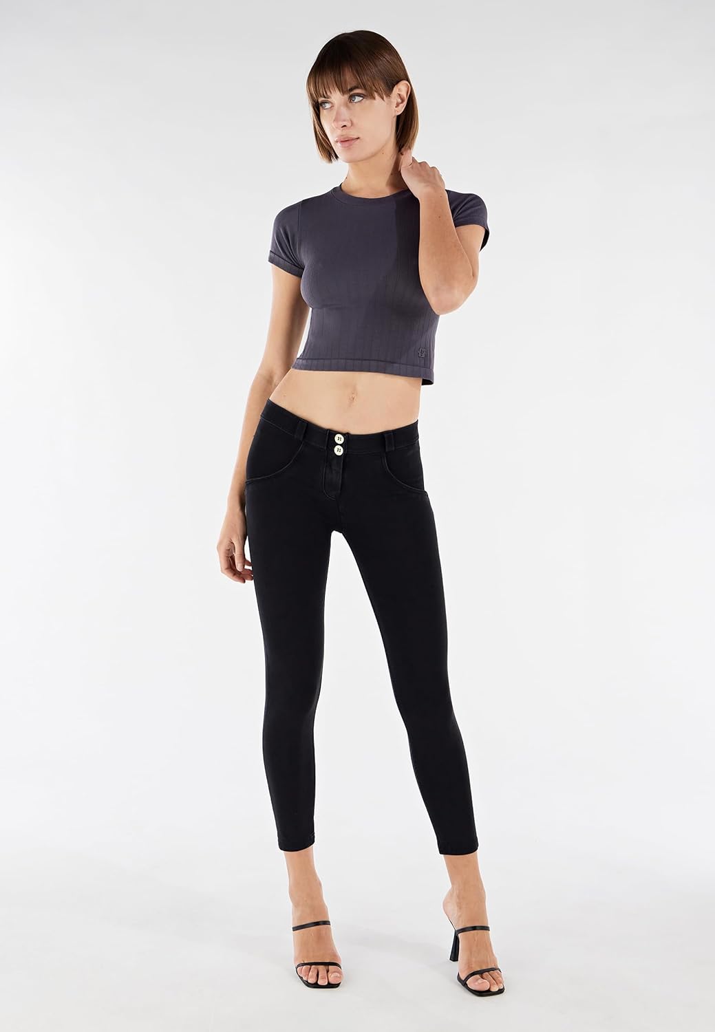 WR.UP high waisted push up leggings in soft stretch and sustainable denim effect jersey, made of organic cotton and recycled spandex, a green choice from Freddy to promote change and support the well-being of the planet. Its standard length combines with the high waist with front zip that wraps the waist and the super skinny fit that gives maximum grip to highlight your femininity, highlighted by Freddy's innovative WR.UP technology, which enhances the figure and gives a shaping and uplifting effect thanks to an original system of inserts and seams. With Freddy, style and durability combine to show off your shapes with full freedom of movement.