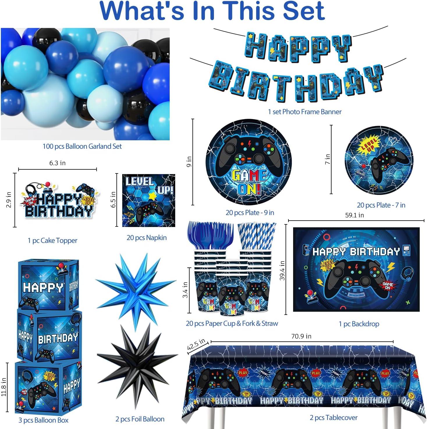 | Included Components | 1 gaming birthday banner, 1 gaming cake topper, 3 balloon boxes, 2 video game table cloth (70.9x42.5 in), 1 gaming backdrop(59x39.3in), 100 balloons,1 black star foil balloon,1 blue star foil balloon, 20pcs 7-inch video game birthday plates, 20pcs 9-inch gamer plates, 20 forks, 20 straws, 20 napkins and cups |