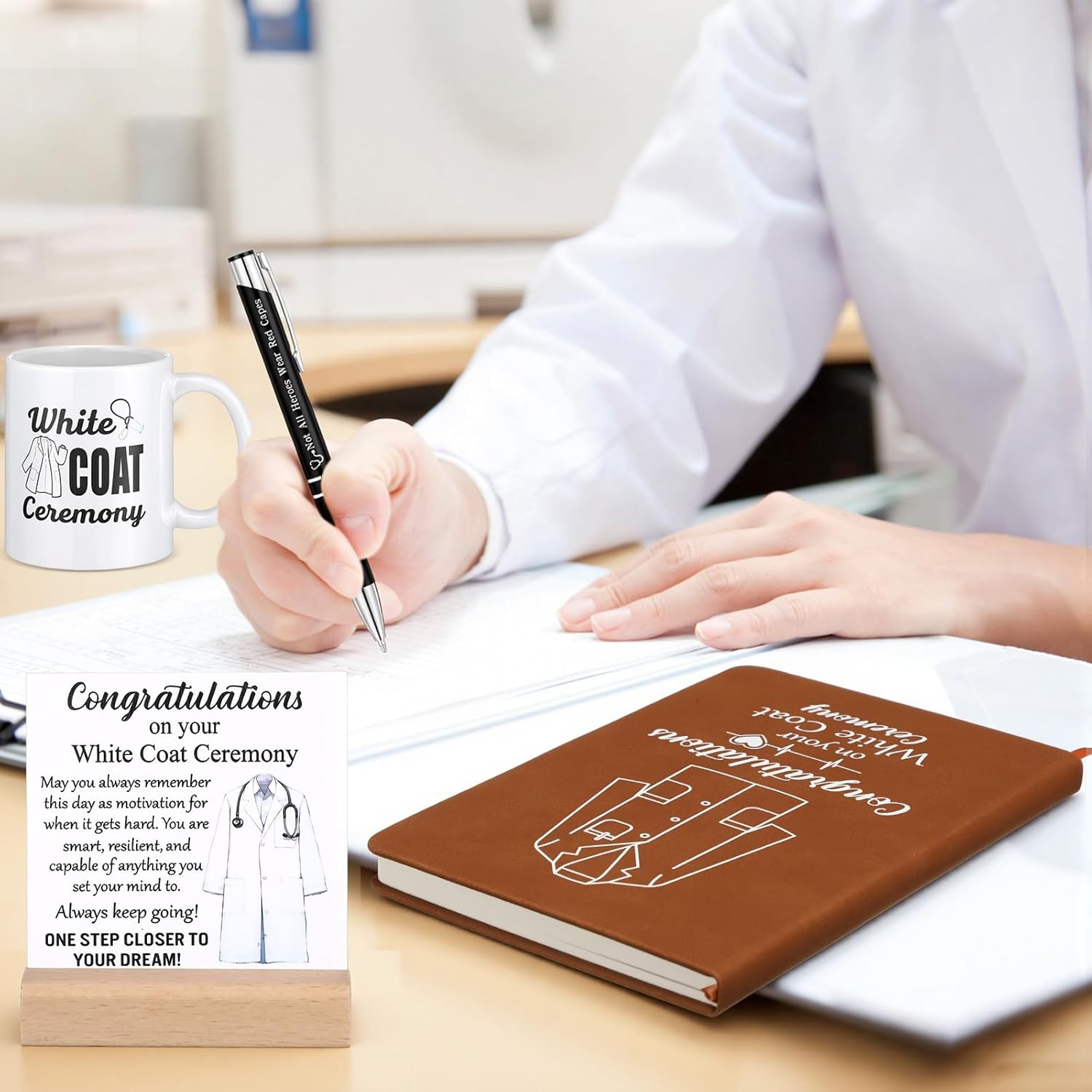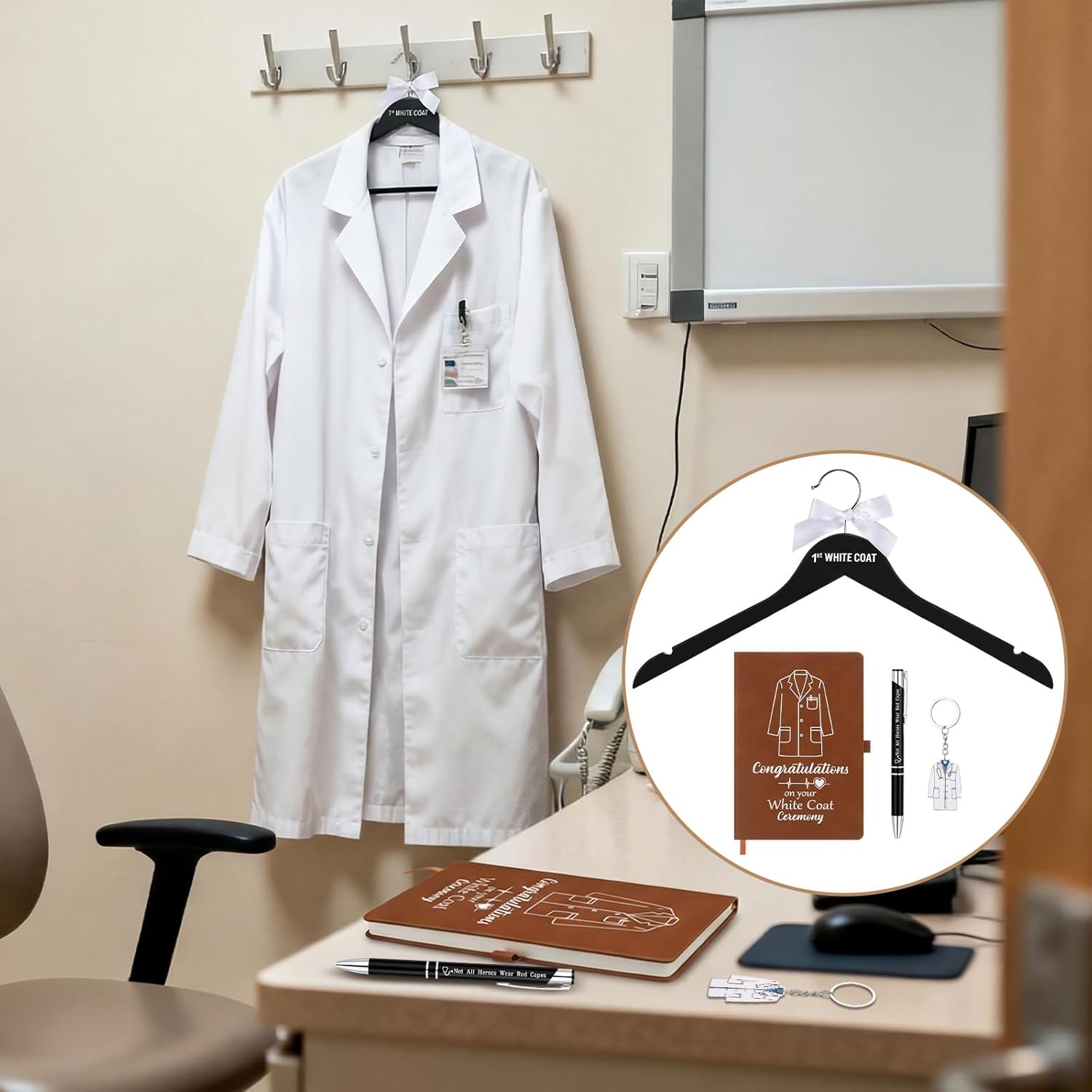 | Included Components | First White Coat Hanger, Pen, Notebook, Ceramic Mug, Wooden Base |