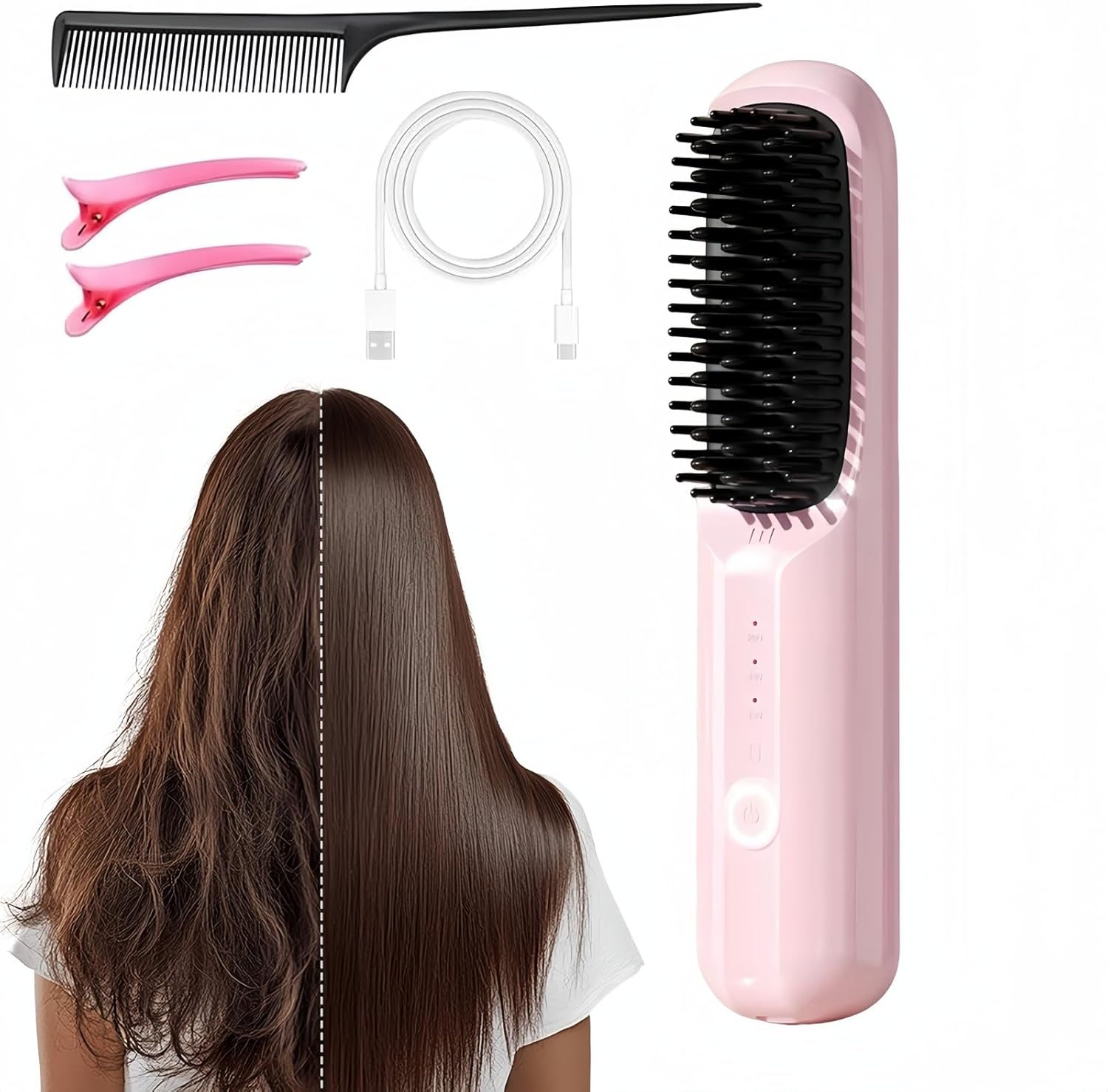 Cordless Hair Straightener BrushColors: Beige, Pink, Purple, BlackSize: 20 × 4.5 cm / 7.87 × 1.77 in3 Adjustable Temperature Settings: 160°C / 180°C / 200°CNotes:Please allow 1–2 cm / 0.4–0.8 in difference due to manual measurementColors may vary slightly due to lighting and monitor display