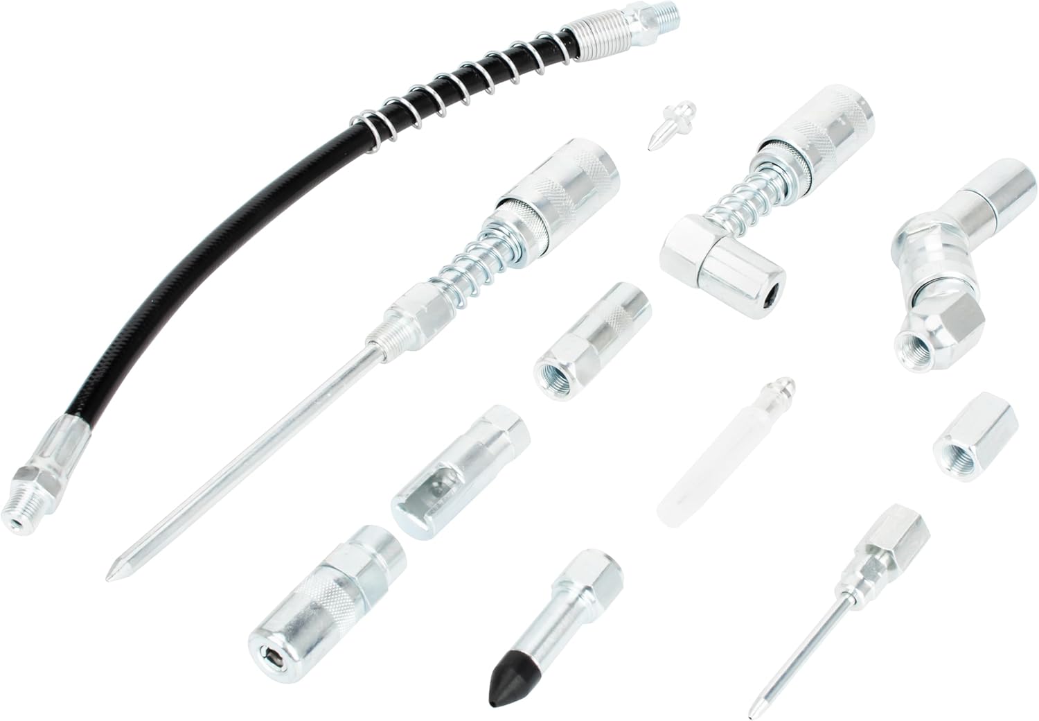 Enhance your grease gun's functionality with our 12 Piece Grease Gun Coupler Set. Designed for universal compatibility with manual and pneumatic grease guns, this set boasts a high-pressure performance reaching up to 18,000 PSI for thorough lubrication. Made from premium stainless steel, these accessories offer exceptional durability with wear resistance and rust-proof properties. The included ripstop case provides a durable and organized storage solution, perfect for keeping tools clean and portable in various work environments. With connectors, nozzle adapters, and flexible hoses included, this comprehensive set simplifies buttering tasks and ensures convenience during use. Upgrade your grease gun with this versatile, durable, and convenient accessory kit today!