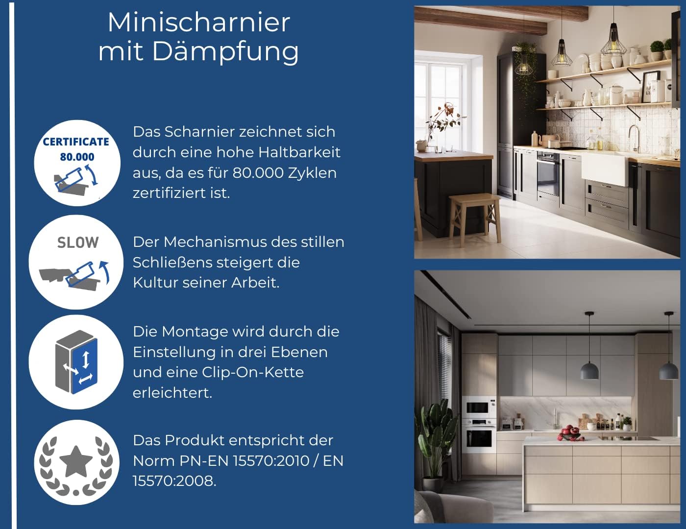 The hinge is characterised by high durability as it is certified for 80,000 cycles. The mechanism of silent closing increases the culture of his work. Installation is facilitated by the adjustment in three levels and a clip-on chain. The product complies with the standard PN-EN 15570:2010 / EN 15570:2008.