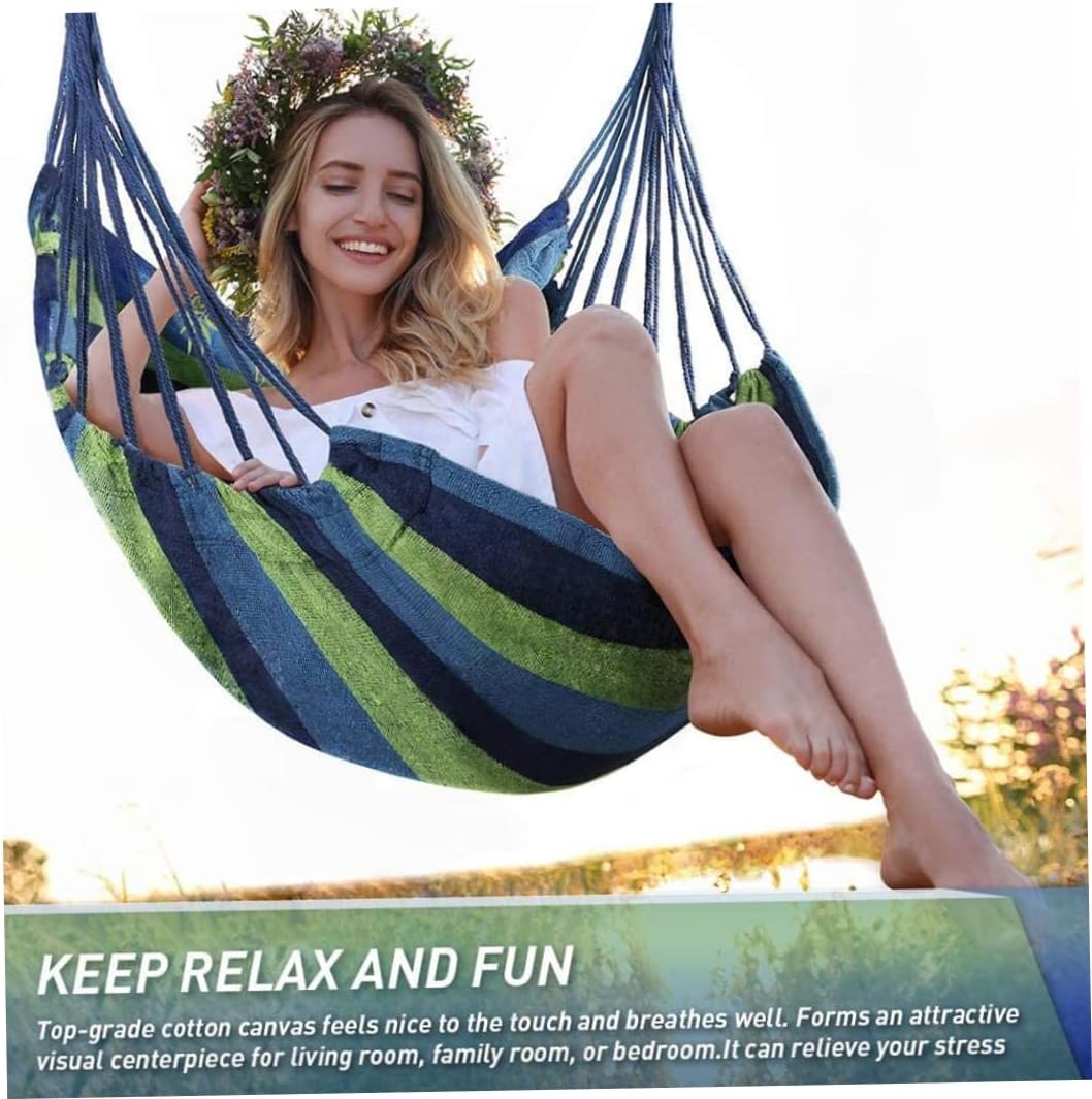 Description Equipped with two cushions for seating and backing, made of soft quilted Cotton Canvas for enhanced comfort, providing the comfort of a hammock paired with back support. It can be easily hung on the branches of the garden, courtyard, and can also be installed in the porch, balcony, terrace, living room, children's room, etc. Features Hammock chair -Color: Green. -Material: Cotton, polyester. -Size: 130x100 cm/51.18x39.37 inch. -Pillow size: 38x38 cm/14.96x14.96 inch. -Actual safety load: 150kg. -Pillow material: Canvas, Cotton. Note: Due to the difference in display and lighting effects, the actual color may be slightly different from the picture. Due to manual measurement, please allow 1-3 cm deviation. Package Including 1 * Hammock Chair2 * Pillow