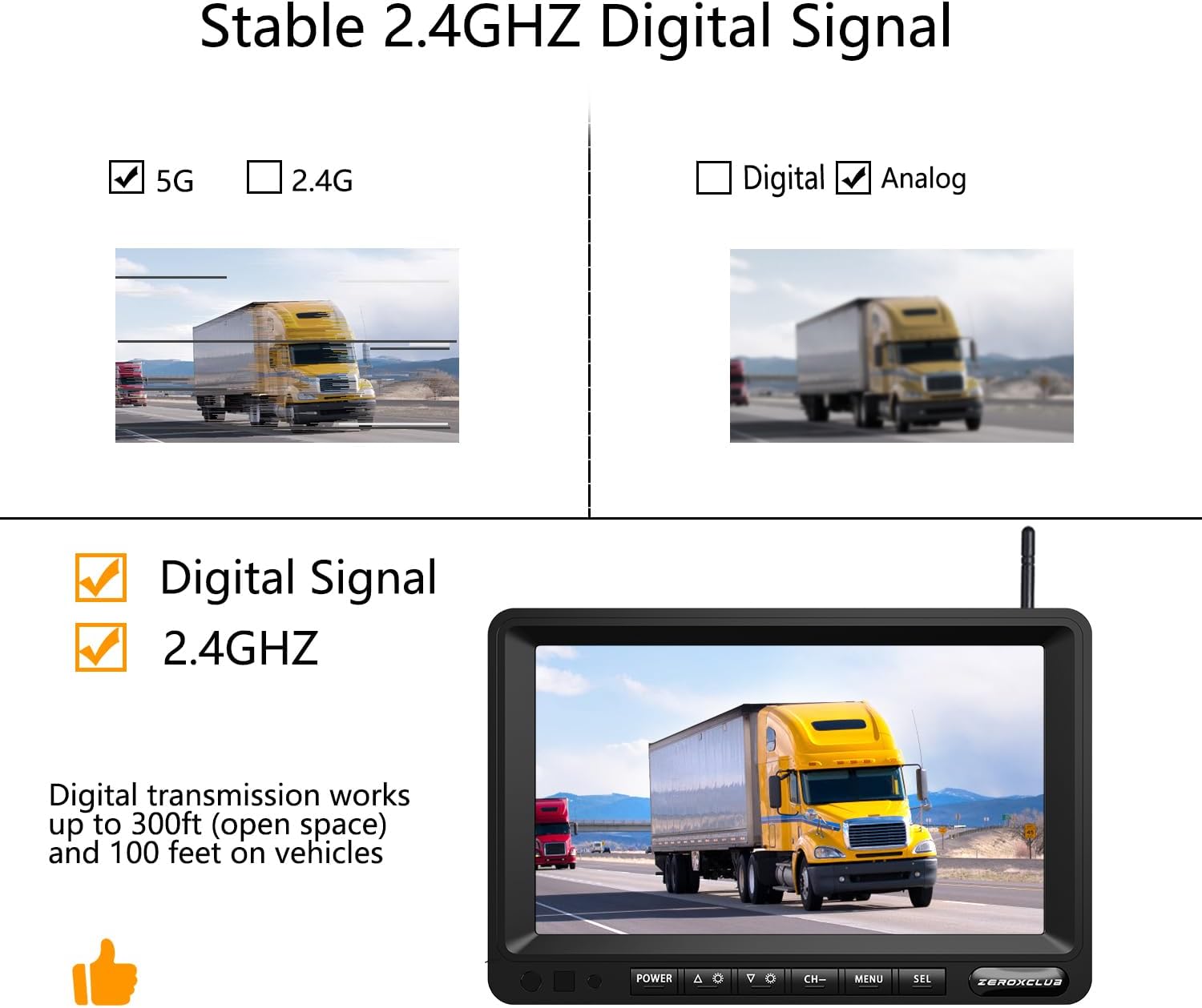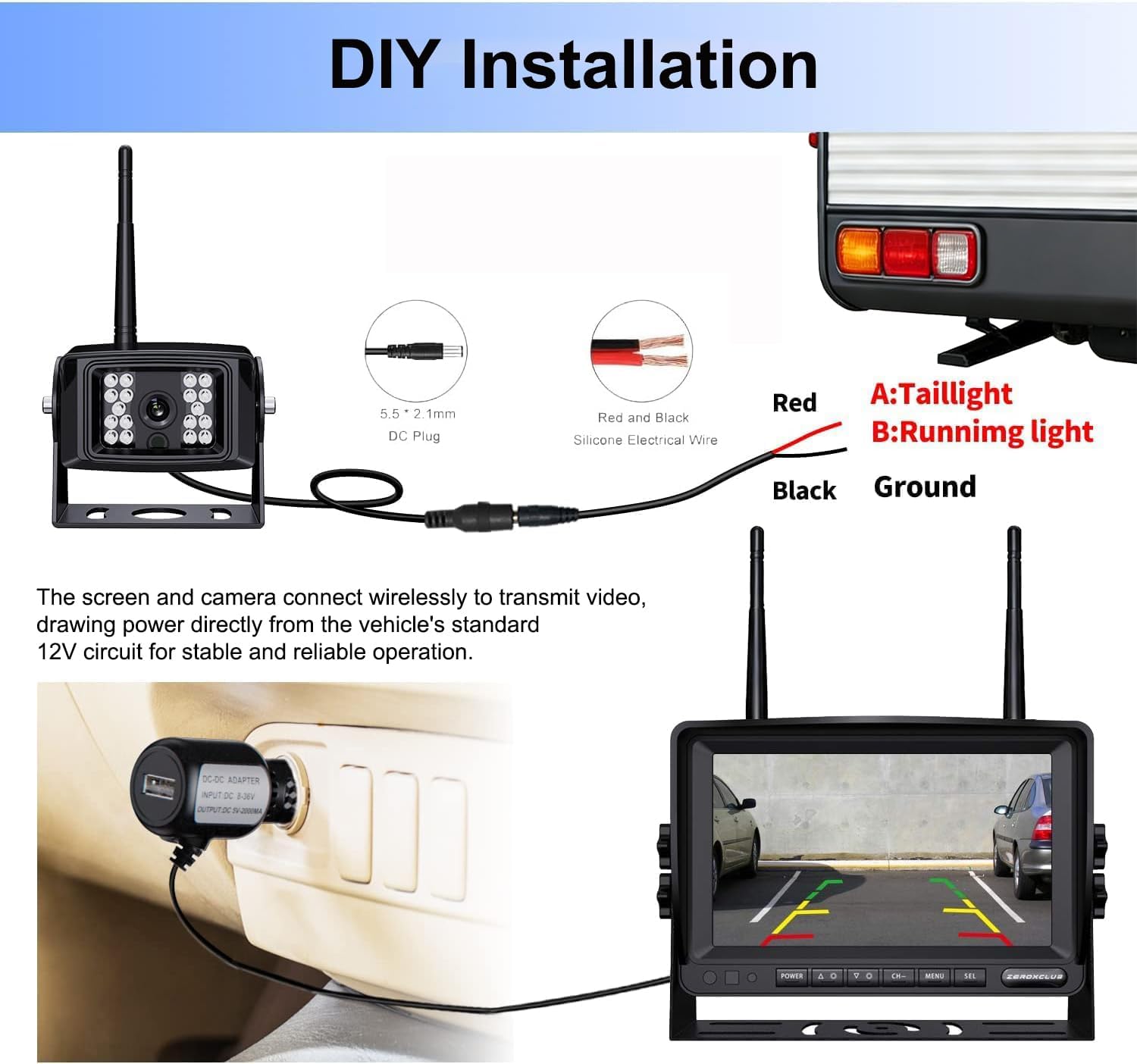 Bigger than other backup camera kits' monitors our 7 inches LCD rear view monitor connects 1 backup cameras by a wireless transmitter Wireless transmitter takes the place of complicated long video cables Make all things much easier and safer Versatile Transmitter – You can install it anywhere near the reversing light Suitable for most cars RVs vans camping cars trucks even trailers Without any interference from other wireless devices it ensures you have stable and high resolution image with 85 ft acceptance range in open areas Full HD Colored Night Vision displayed in 7 inches screen must give you more confidence and safety at night driving! Monitor Installation 1 Connect the rear view monitor to cigarette lighter socket 2 Turn on the monitor switch Camera Installation 1 Connect the black wire of the camera to negative pole,red wire to DC12V or DC24V voltage 2 If you connect it to taillight it will work when reversing If you connect it to running light it will work when reversing Technical Specification Monitor Screen size 7-inches Power DC12V-24V Lens Viewing Angle 149 Degrees Resolution 1920x1080 - RGB Operating Temperature -25 60 degrees centigrade Backup camera Processor Digital FHD image processor with CCD Video output RCA connector 1 0vp-p 75ohm Waterproof IP Rate IP69K Operating Temperature -25 to 60 degrees centigrade Package Includes 1 x 7-inch LCD Monitor 1 x Rear view Camera 1 x Cigarette Lighter adapter with on/off 2 x Power cord 2x TV Antenna 2x Installation kits 2 x Fixed Bracket kit 1 x Sunshade 1 x User Manual