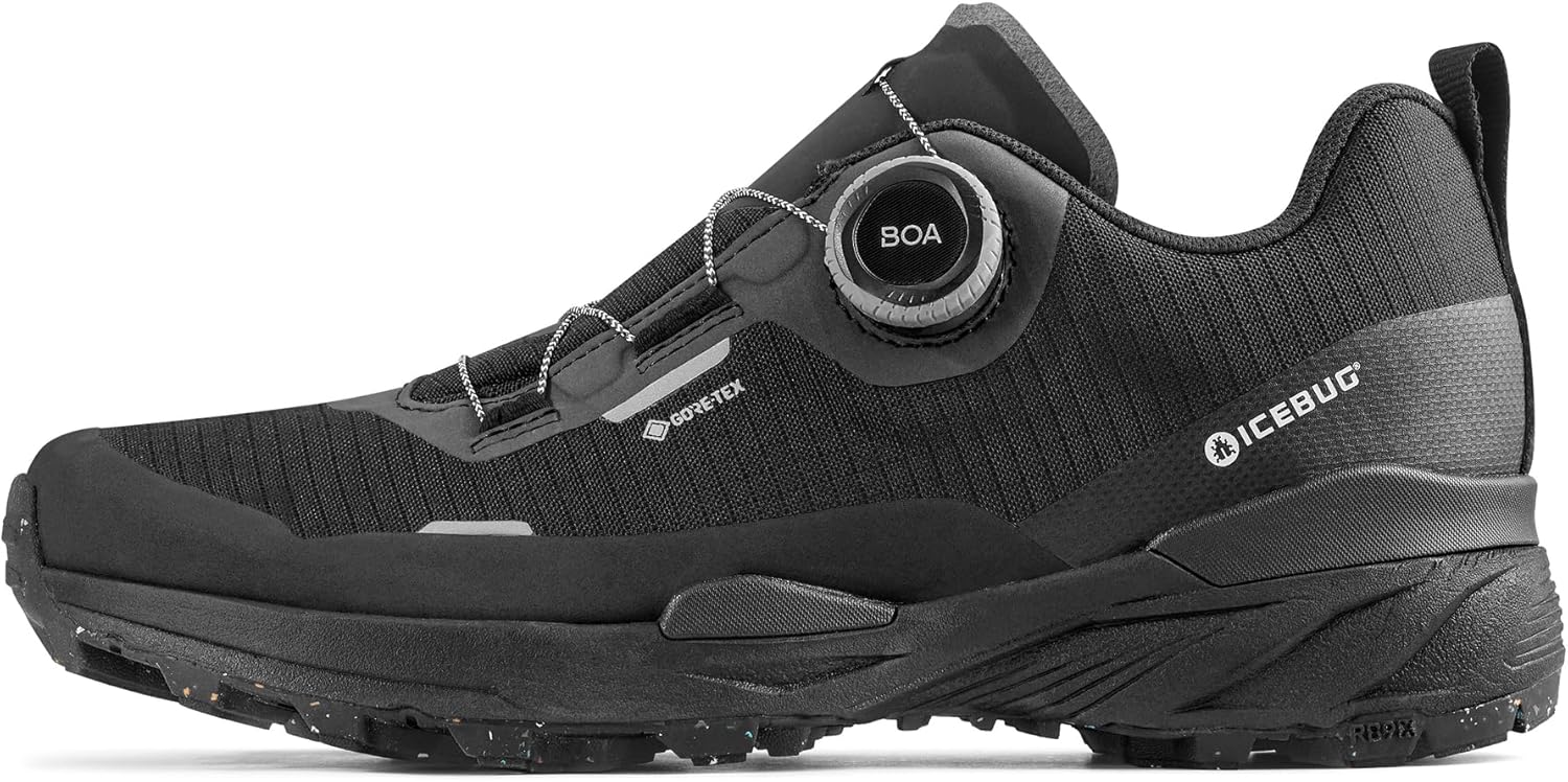 The Icebug Rover 2 is a versatile outdoor shoe designed to provide protection, comfort, and stability across various terrains and weather conditions. The upper is made from recycled, durable CORDURA polyester and features a waterproof GORE-TEX membrane, keeping feet dry while ensuring breathability. Reflective details enhance visibility in low-light conditions, adding to overall safety. The precisely adjustable BOA Fit System allows for a customized fit, ensuring optimal support. The RB9X outsole, combined with a specially designed tread pattern, delivers reliable traction on wet, dry, and uneven surfaces, including muddy or rocky trails. A fully cushioned midsole provides excellent comfort, even during extended wear. The high torsional stiffness ensures stability, while the generously designed toe box allows for natural foot movement. The Icebug Rover 2 is a durable and functional outdoor solution, combining long-lasting materials, innovative technology, and thoughtful construction for versatile use.