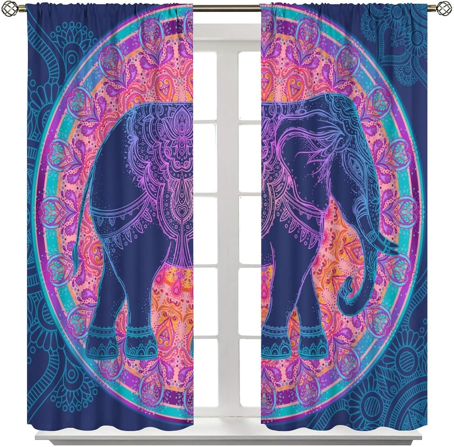brebasf Indian Mandala Eleghant Patterned Blackout Curtains Comes in eight sizes: Total size: 45" L × 42" W (114cm × 107cm),Includes two pieces, each of which measures:45" length × 21" width (114cm × 53.5cm). Total size: 54" L × 42" W (137cm × 107cm),Includes two pieces, each of which measures:54" length × 21" width (68.5cm × 53.5cm). Total size: 63" L × 42" W (160cm × 107cm),Includes two pieces, each of which measures:63" length × 21" width (160cm × 53.5cm). Total size: 63" L × 55" W (160cm × 140cm),Includes two pieces, each of which measures:63" length × 27.5" width (160cm × 70cm). Total size: 63" L × 63" W (160cm × 160cm),Includes two pieces, each of which measures:63" length × 31.5" width (160cm × 80cm). Total size: 72" L × 63" W (183cm × 160cm),Includes two pieces, each of which measures:72" length × 31.5" width (183cm × 80cm). Total size: 63" L × 72" W (160cm × 183cm),Includes two pieces, each of which measures:63" length × 36" width (160cm × 91.5cm). Total size: 84" L × 84" W (214cm × 214cm),Includes two pieces, each of which measures:84" length × 42" width (214cm × 107cm). This Colorful Mandala Boho Hippie Art Theme Curtains liven up your indoor or outdoor spaces with a sense of airiness and beauty.Function: 1. Made of durable polyester fiber,soft and light. 2 The package includes: 2 panels. Curtain material: 98% polyester fiber. Provide a beautiful appearance for your bedroom,living room or office. 3. The curtains are grommet,which can be used with any standard curtain rods. Our products can be used as living room,room curtains. Mother's Day,Christmas,Halloween,Thanksgiving,New Year's party decorations at home! We believe that you will like this curtain as much as we do. If you are not satisfied with our products,please contact us,we will solve any problems encountered by the products for you,so that you are satisf