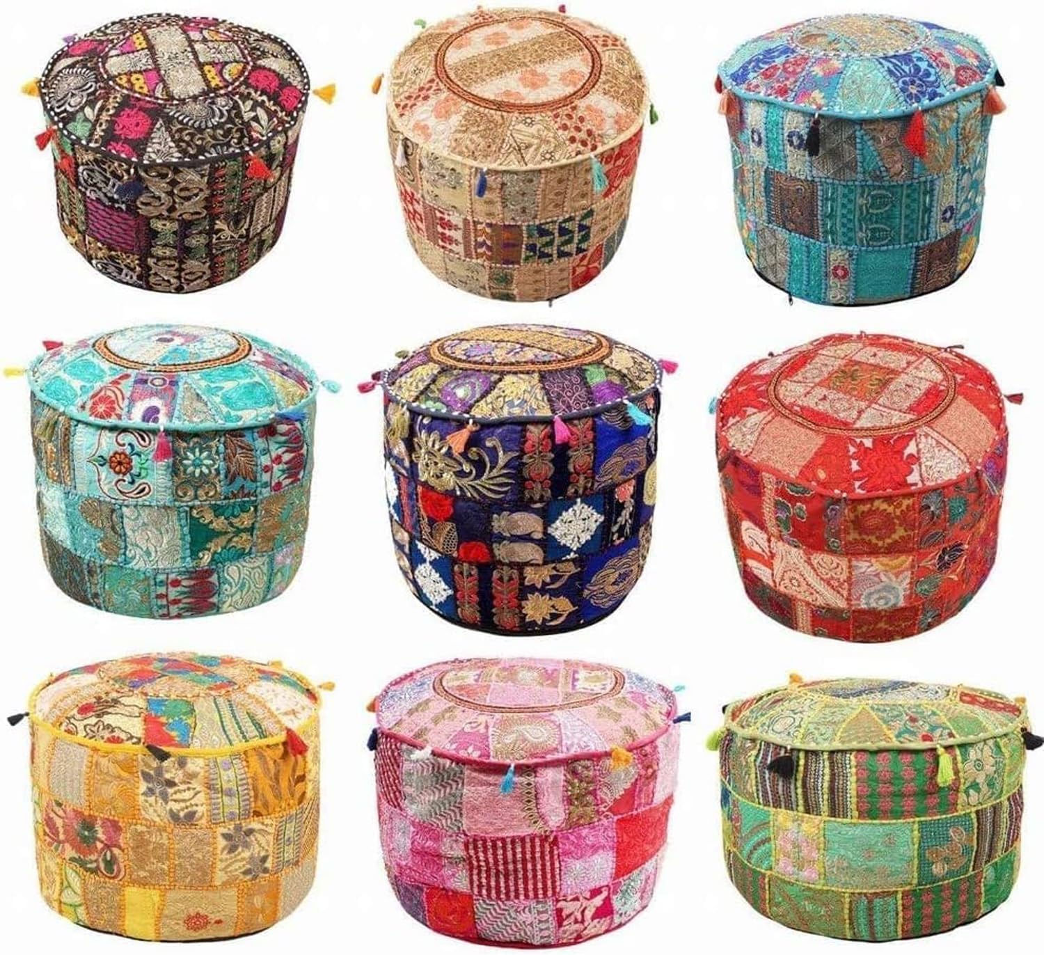 Vibrant and colorful handmade "KHAMBADIA" ottoman pouf cover from Rajasthan, India! Incorporates sophisticated patchwork in many shades of vibrant color made from many exquisite and carefully chosen and arranged cuttings from saris, lehngas and wedding dresses. This stunning piece can be easily filled with scraps of fabric or store-bought filler material, and used as a comfortable seat or home accent piece! Comes unfilled so as not to increase shipping weight. Get a few to place around the house to imbue it with color, coziness and comfort. This authentic and ethnic piece of Indian artistry is a perfect addition to any household! How to Fill: Easily fill from bottom opening with polyfiber or polystyrene (used in bean bags), cotton or scraps of fabric.