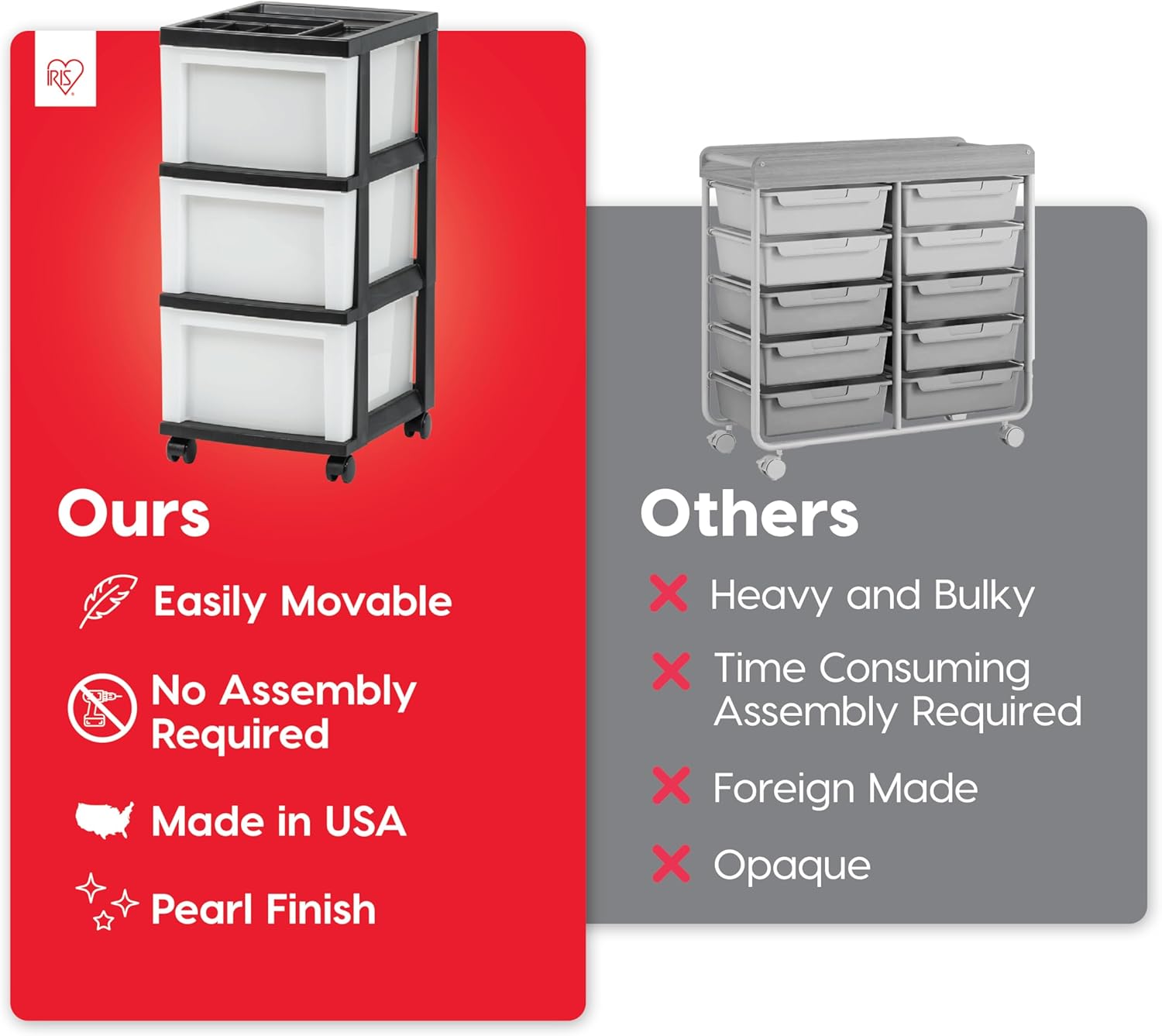 IRIS USA Storage Drawer Cart IRIS USA Drawer Cart offers a practical storage solution for any room of the home. Organize and store a variety of household items that are frequently used in the bedroom, kitchen pantry, bathroom, craft room, nursery, or dorm room. It could be used to store important documents, paper, files, or stationaries at the office. Pearl drawers make contents private while keeping them neat and contained. Drawer stops prevent drawers from being removed accidentally. Use the included casters to create a rolling storage option allowing you to easily transfer the unit from room to room at your convenience. This black drawer cart has a multi-purpose use and is a versatile storage option for any room of the home. It's Ideal for controlling clutter and keeping living spaces neat and organized. The cart’s top lid is designed to organize small parts for easier accessibility. This could be used to place pens, paperclips, paper and so much more. IRIS USA Plastic Drawer Carts are made in the USA. All of our products are Green-circle certified. We can organize our home and protect our Earth at the same time!