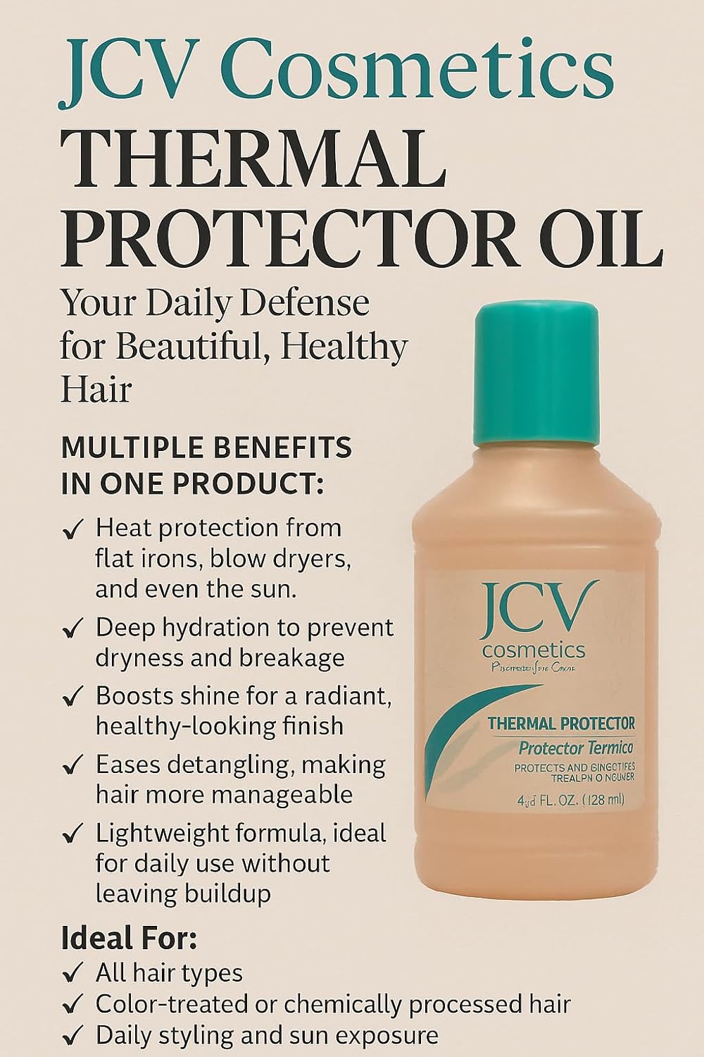 Transform your hair care routine with JCV Cosmetics Thermal Protector Oil, a comprehensive solution for maintaining beautiful, healthy hair. This versatile 4.2 FL OZ formula provides essential heat protection against flat irons, blow dryers, and sun exposure while delivering deep hydration to combat dryness and breakage. The lightweight formula won't weigh your hair down, making it perfect for daily use without product buildup. Experience easier detangling and enhanced manageability while achieving a radiant, healthy-looking finish with boosted shine. Suitable for all hair types, including color-treated and chemically processed hair, this thermal protector seamlessly integrates into your daily styling routine. The non-greasy formula protects and smooths your hair, ensuring it stays manageable and lustrous throughout the day. Whether you're heat styling or heading out in the sun, this protective oil serves as your hair's daily defense against environmental stressors while maintaining its natural beauty.