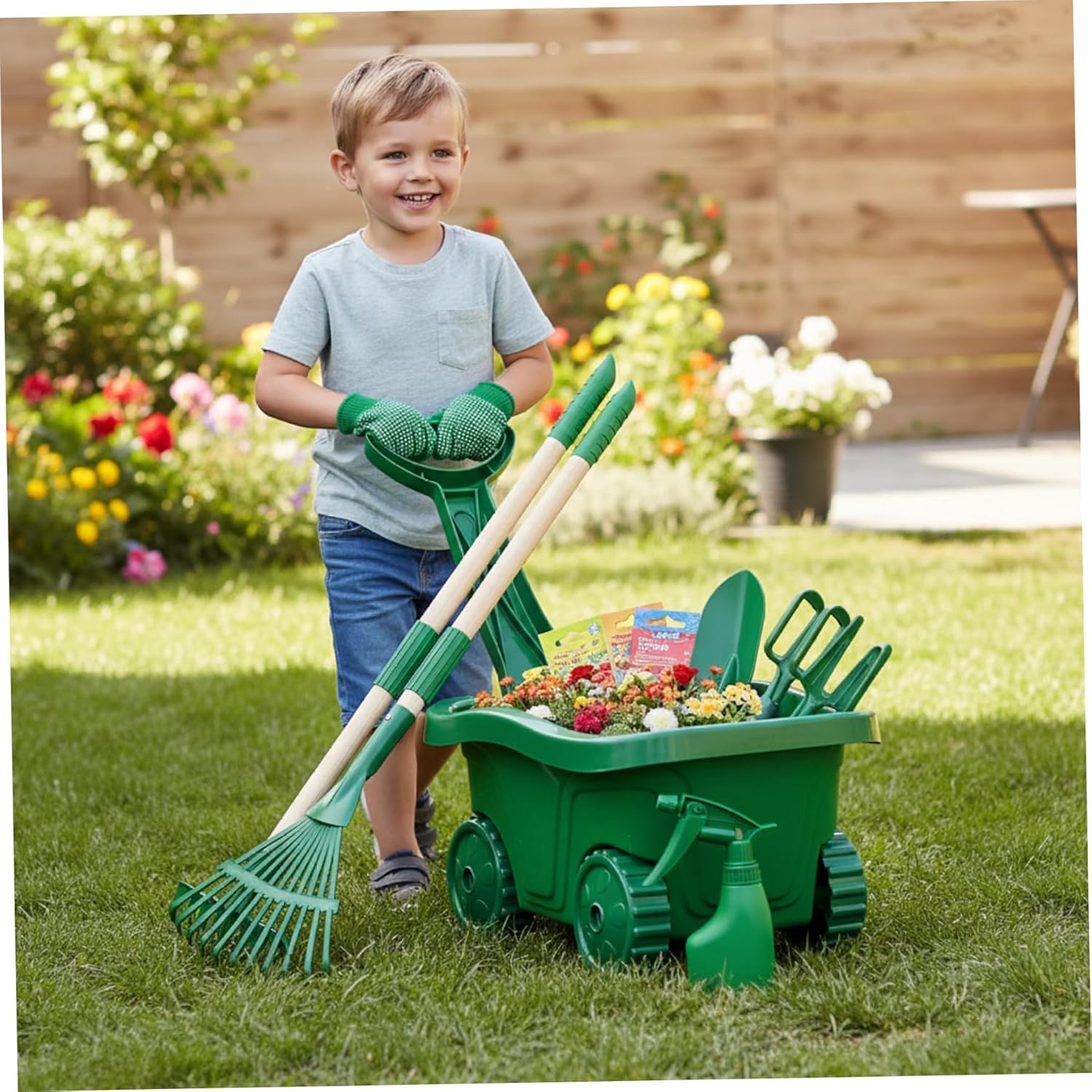 Description: This comprehensive 7-piece Kids Gardening Set is thoughtfully designed to inspire toddlers to explore nature through safe, engaging outdoor play. Equipped with a child-sized green wheelbarrow and four long-handled wooden tools including a shovel, rake, leaf rake, and hoe, plus gardening gloves and a spray bottle, it provides a full gardening experience perfect for little hands. Crafted from , materials, the set ensures safety and longevity while supporting skill development and environmental awareness. Ideal for backyard play, it helps children enhance fine motor skills, understand plant growth, and develop a love for nature. This gardening kit encourages family interaction and makes a productive alternative to screen time, fostering healthy habits and outdoor enjoyment. Perfect for young kids eager to help in the garden, it keeps their seeds, tools, and watering cans organized in one easy-to-move wheelbarrow, making gardening fun and accessible. This set combines educational with playful design, making it an excellent gifting for fostering creativity and outdoor activity. Features:. -Color: Green. -Material: Steel. Note:Manual measurement, please allow slight errors on size.The colors may exist slight difference due to different screens. Package Including 1 * Kids Gardening Set