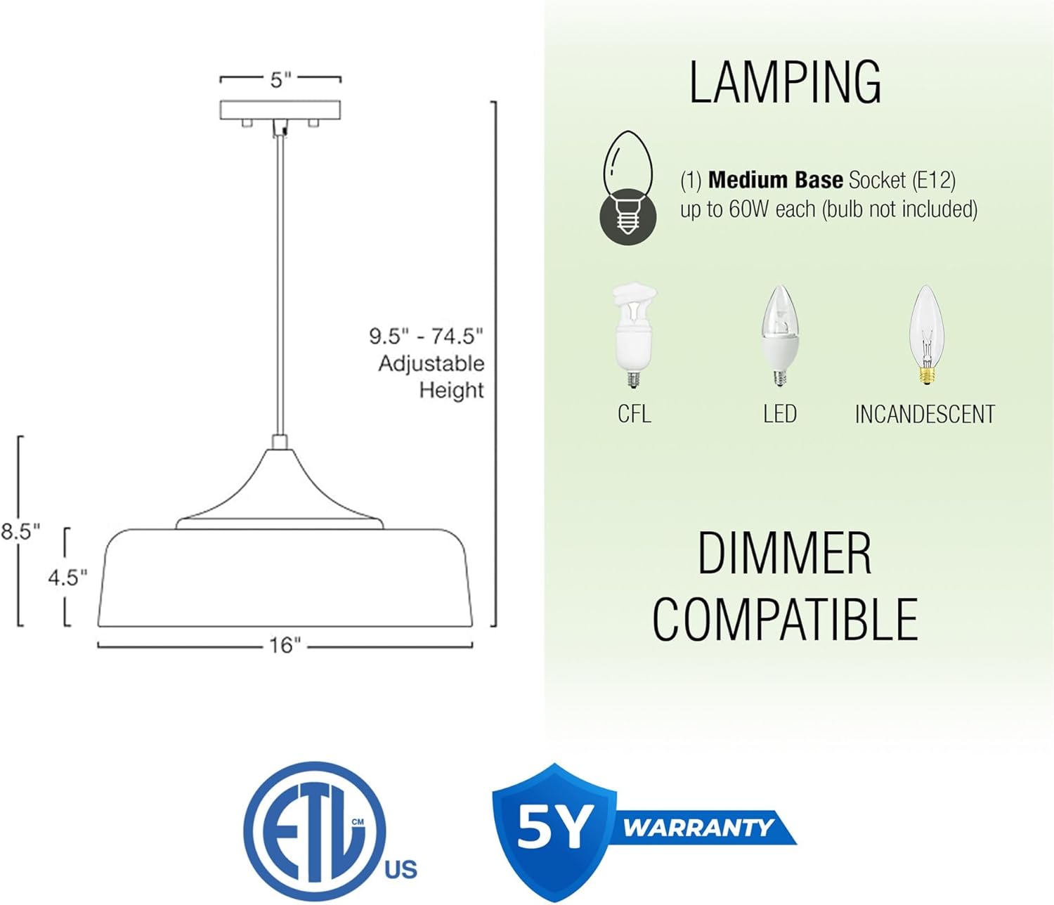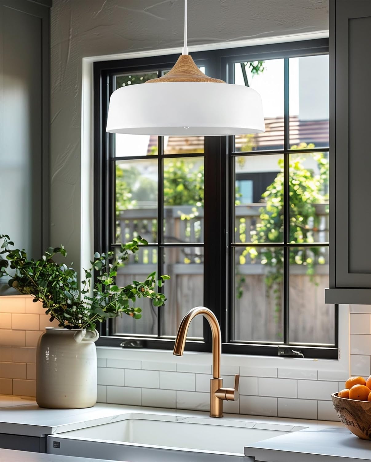 Kira Home's Riley 16" pendant light boasts stylish wood finish accents and a sleek white metal shade. Though vintage and antique in style, the clean and classic design works well in a variety of environments such as contemporary rustic, industrial, farmhouse / barnhouse, schoolhouse, and retro. A telltale sign of great taste, hang this unique fixture in a variety of locations. As a single statement piece, Riley works well above cafe and bistro tables, creating cozy and intimate mood lighting in a restaurant, bar or home. Combining style and function, the Riley pendant also works well above the kitchen sink or table or above a laundry room sink. Inspired by factory lighting of the early 20th century, dress your home in a set of 2-3+, mount above the kitchen counter or island creating a linear and cohesive effect with ample lighting. Enhance your home or hospitality settings today with the Riley!Riley is ETL listed and approved for your safety.Includes: Mounting HardwareLighting Direction: DownlightLighting Source Type: Incandescent, LED, CFLMounting Style: CeilingBase Type: E26Shade Shape: DomeShade Material: MetalProp 65 Warning: YesProp 65 Harm: cancer, birth defects, and/or other reproductive harmsProp 65 Chemicals: LeadSafety Rating: ETL ListedLocation Rating: Dry