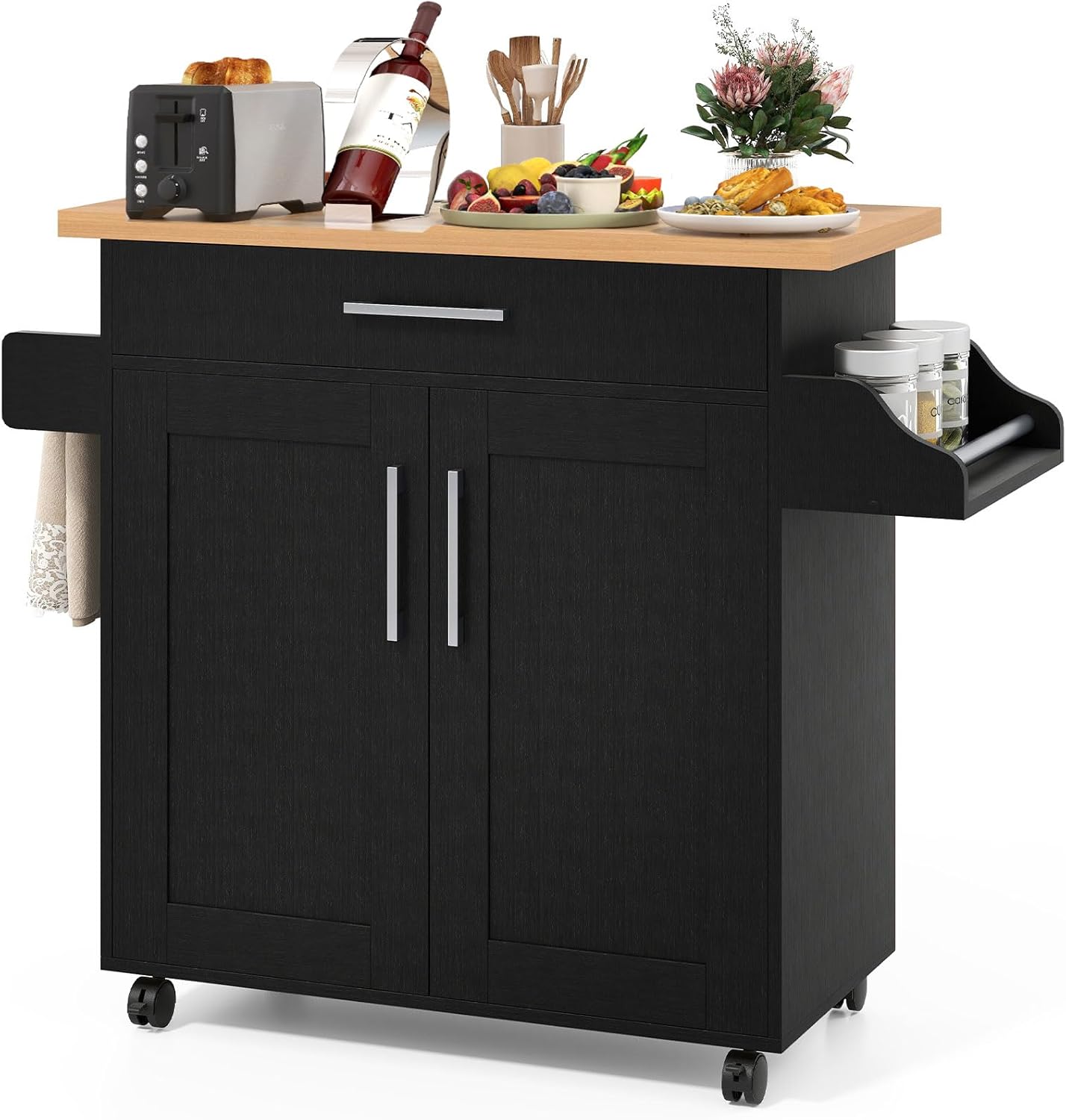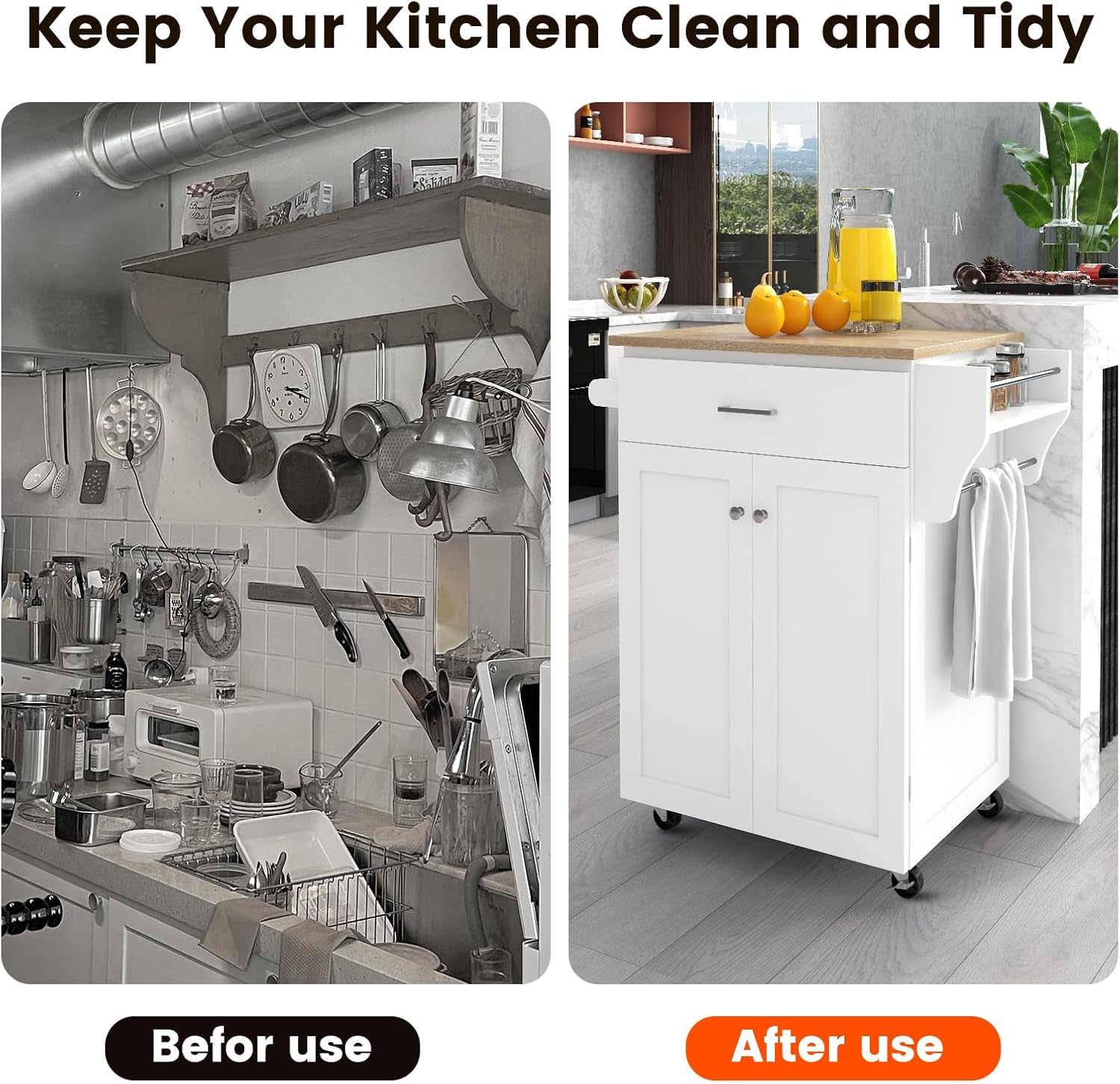 Deascription:Eliminate kitchen clutter effortlessly with our stylish and practical movable kitchen island! The multi-functional rolling cart features a deep drawer, door cabinet, wide countertop, spice rack, and towel holder, offering ample space for preparation and storage needs. Whether you seek extra workspace, organization, or space utilization, this versatile island stand is the ideal solution, suitable for various locations beyond just the kitchen.Features:Made of high quality MDF, this kitchen storage cart is built to last.2 Doors cabinet with adjustable shelf to customize exclusive spaces.A large drawer come with convenient handle and wood glides for easy access.2 Doors with magnetic catch to keep the cabinet closed tightly.4 Universal plastic wheels for easy mobility, 2 of which are lockable.Towel rack and spice rack double as storage space and handles.The smooth surface is easy to clean and maintain.Perfect for kitchen, restaurant, or anywhere you need more extra storage.Simple and stylish design can be matched with any style.Specification:Color: WhiteMaterial: Rubber Wood, MDFOverall Dimensions: 32"L x 19"W x 36"HTable Dimension: 25"L x 19"WDoor Dimension: 11"W x 26"HDrawer Size: 23"L x 5.5"WClearance from Ground: 3"Weight Capacity of the Tabletop: 66 lbsWeight Capacity of the Drawer: 18 lbsWeight Capacity of the Shelf: 22 lbsNet Weight: 51 lbsPackage Includes:1 x Kitchen Island Cart1 x InstructionWhy You Choose Our SILKYDRY Kitchen Island Cart with Wheels?√ The stylish and attractive kitchen trolley offers ample storage options for different storage needs√ Side towel rack and spice rack provide extra space and can be used as handles to push the kitchen cart.√ 4 smooth casters ensure mobility of the kitchen island and 2 of the wheels are lockable to provide stability and safety.