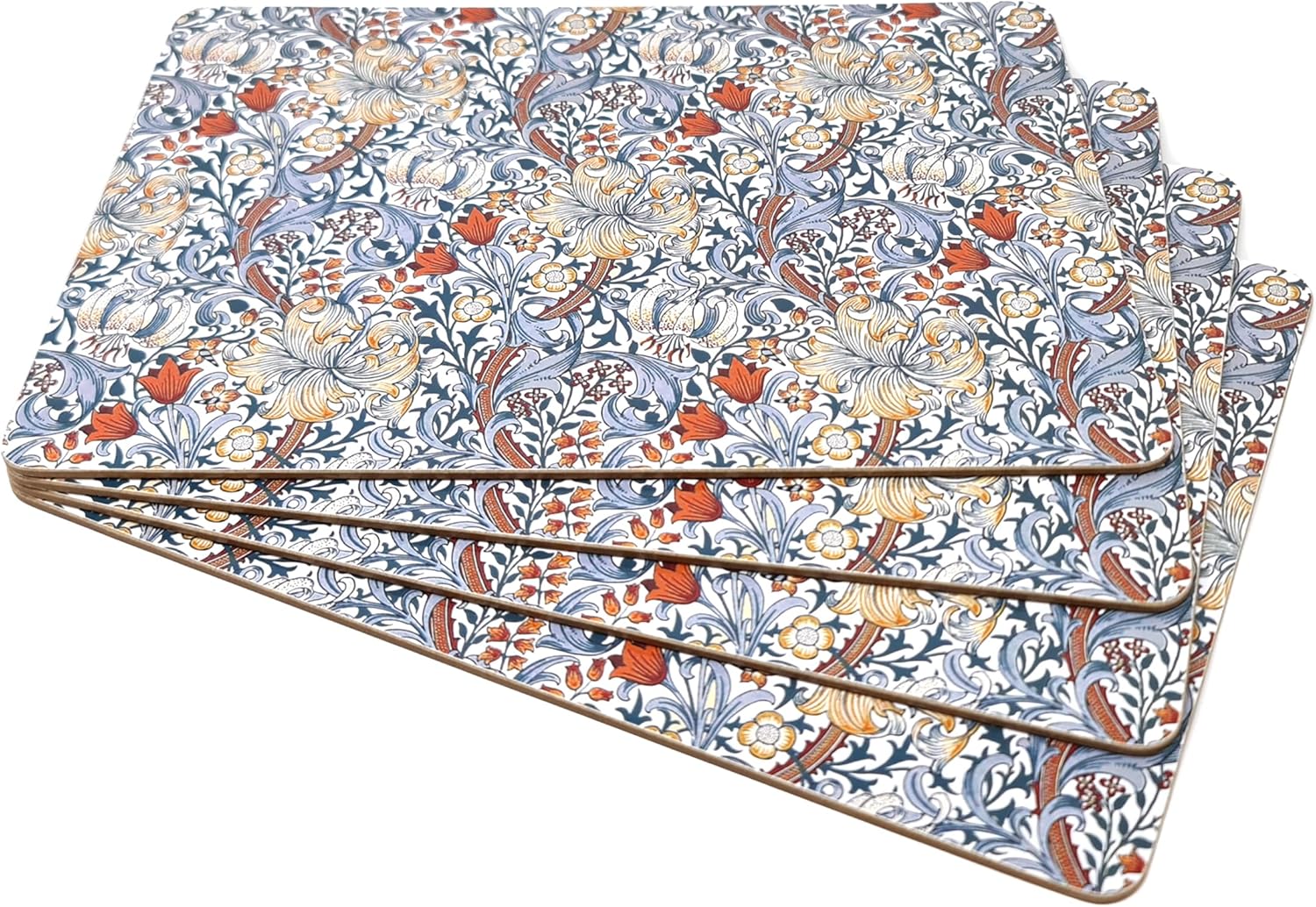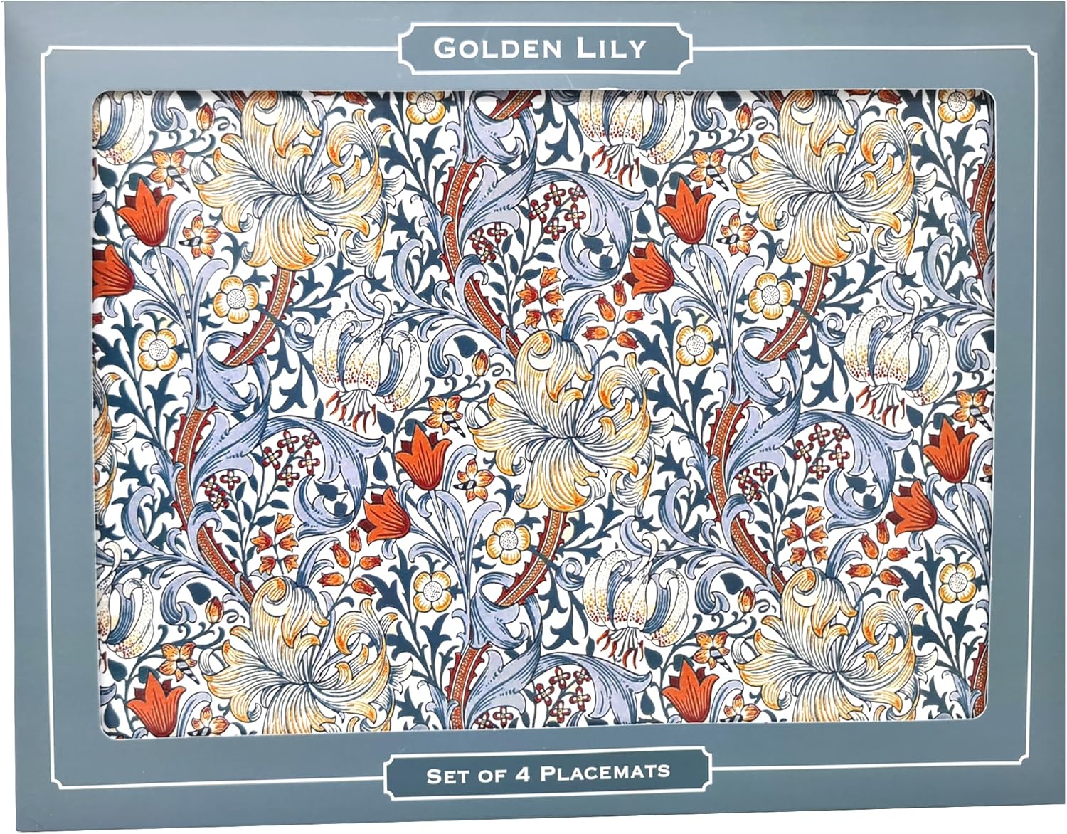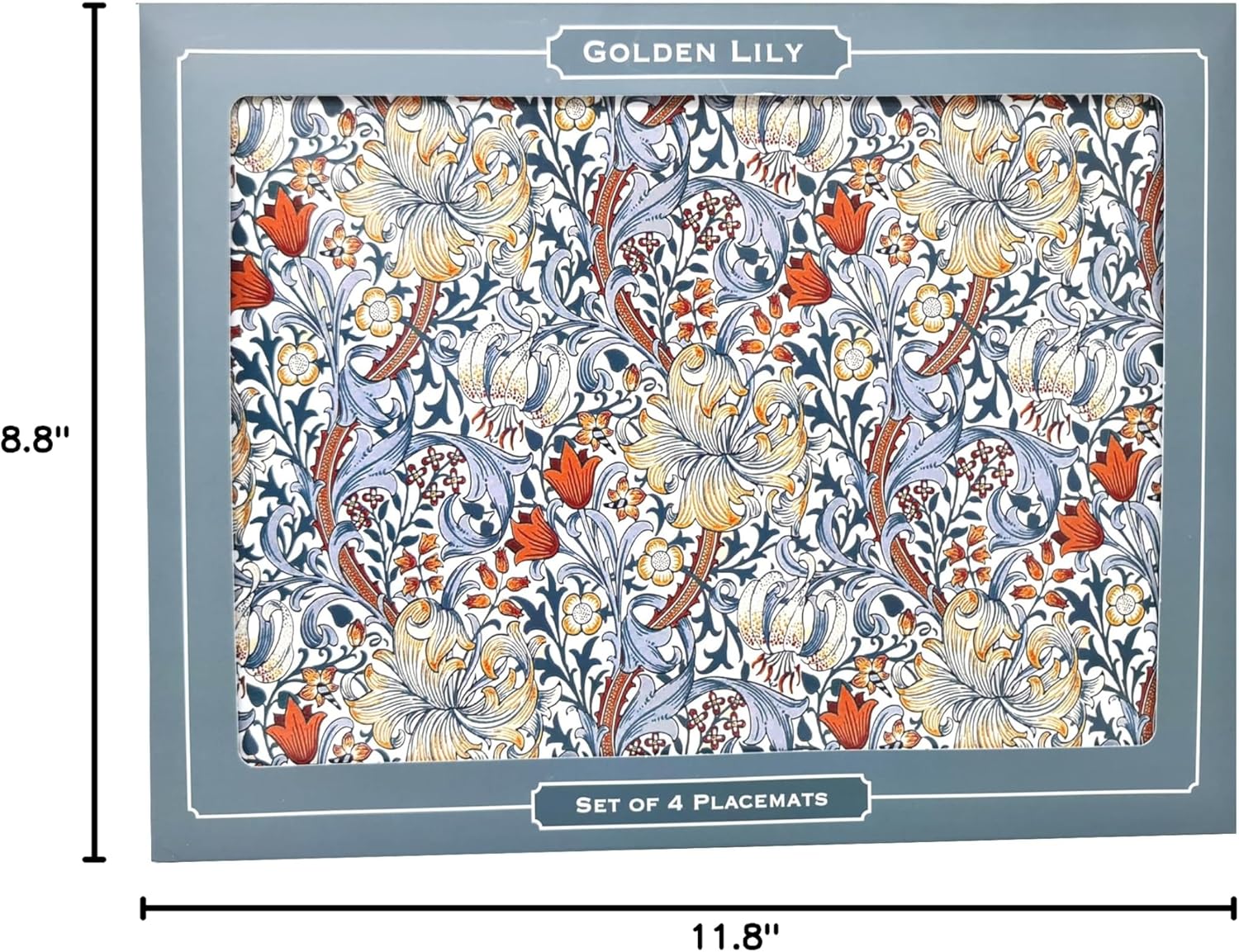 Stunning set of 4 dining table place mats featuring Golden Lily design artwork by William Morris.Easy to clean laminated heat resistant surface with non slip cork bottom.Approximate Size: 11.8" (29cm) x 8.8" (22cm)Would make a fabulous eye catching addition to any coffee or dining table.Supplied in presentation box making it an ideal gift idea.