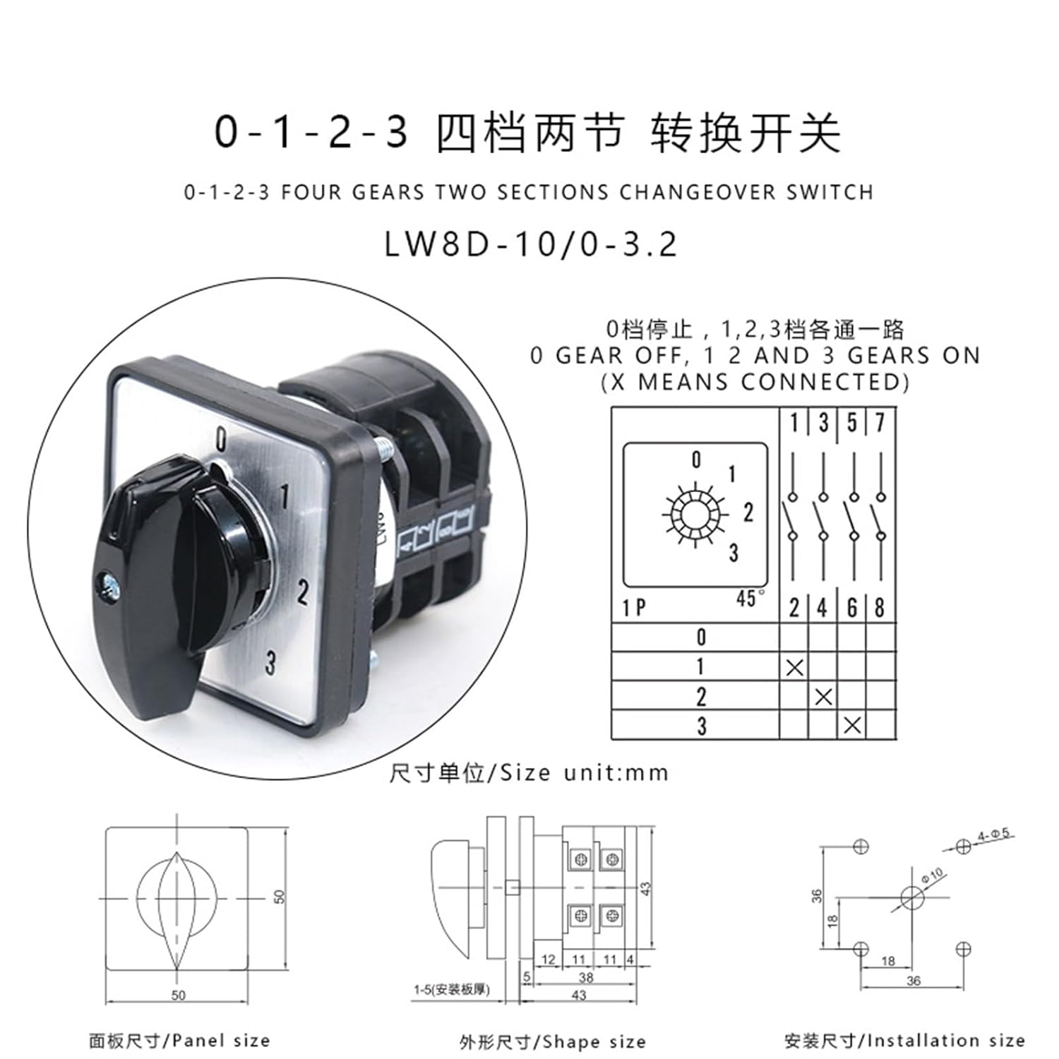 Tactile SwitchesLW8D-10/0-3.2 Two Phases Four Positions 10A 660V Cam Power Knobs Selection Changeover Switch Reversing Rotary 1Pcs==========Current : 10AMaterial : PlasticSwitch Type : Universal SwitchModel Number : LW8D-10/0-3.2Features : 2 PhaseItem Type : SWITCHESRated insulation voltage(Ui) : 660VConventional heating current(Ith) : 10AUse category : AC-15Rated working voltage(Ue) : 440VRated working current(Ie) : 1.5A