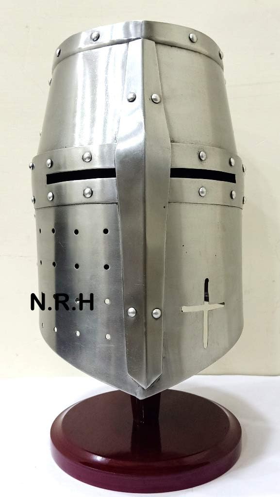 Medieval Silver Crusader Knight Templar Helmet Premium Steel Halloween Helmet | Props & Head Wear Larpers Helmet With Wooden Stand