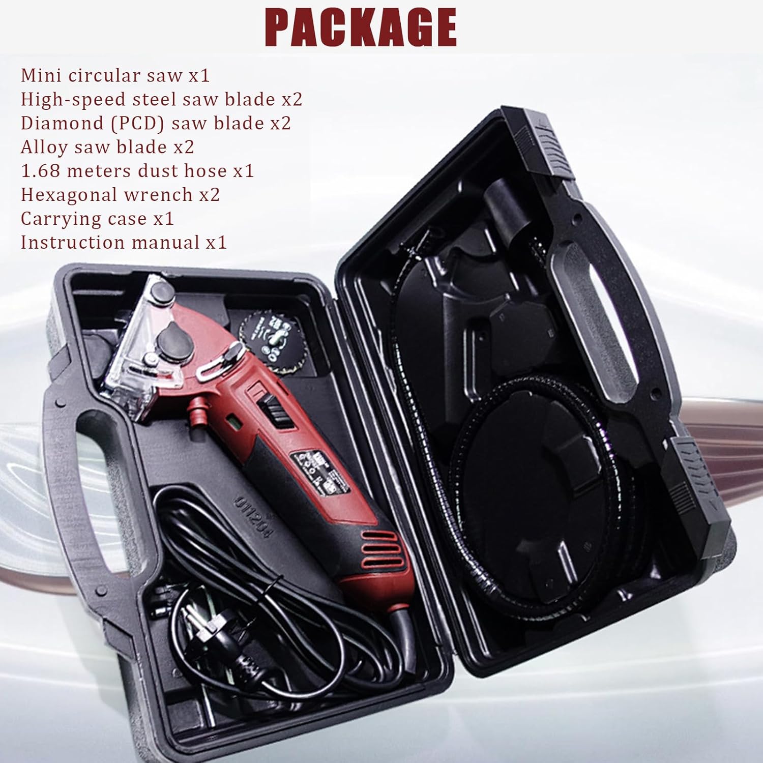 This mini circular saw set is a versatile and powerful tool perfect for a wide range of cutting tasks. With its compact and lightweight design, it's easy to maneuver and handle, making it ideal for tight spaces and overhead work. The 400W high-powered motor delivers impressive cutting performance, allowing you to effortlessly slice through drywall, tile, metal, wood, and more. The set includes three different blades, ensuring you have the right blade for the job at hand. Whether you're a professional contractor or a DIY enthusiast, this multi-function circular saw will become an indispensable addition to your toolkit. Conveniently packaged in a sturdy tool box, it's perfect for storage and transportation. With its precision cutting capabilities and versatility, this mini circular saw set is a must-have for any serious woodworking or renovation project. (Blade diameters: 3.5 inches or 8.9 cm, 4 inches or 10.2 cm, and 4.5 inches or 11.4 cm)