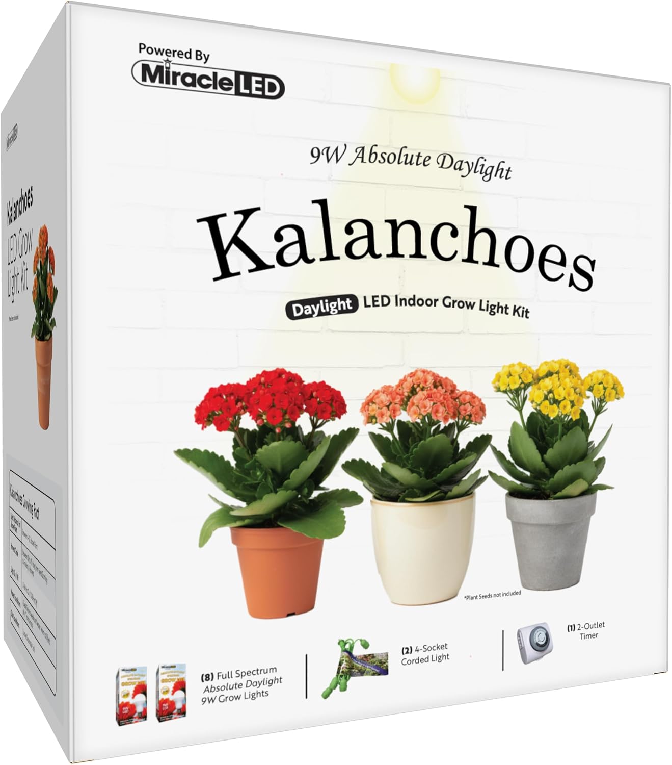 Looking for a grow light that will help your Kalanchoe plant grow and thrive? Use Miracle LED’s Kalanchoe Grow Light Kit to help your plants live to their fullest potential! Kalanchoe plants are unique and beautiful plants but too little or too much light can stump their growth and development. Our 9W Absolute Daylight kit which uses the power of full spectrum to provide the nutrients your plants need to grow nice and full, helps you be in control of the distance and amount of light your plant receives. Kalanchoe plants need 4-8 hours of bright indirect light to properly grow! The 9W Absolute Daylight Bulbs are designed to replicate the light spectrums found in Professional Grow Farm equipment right in your home! Plus, enjoy the strong and water resistant 4-socket that makes it easy to setup anywhere in your home, apartment, or dorm room elevating your home aesthetic. You’ll never have to sacrifice the layout of your home; just plug in and hook on where ever it is needed. The timer included in your kit is great for controlling the amount of light your plant is receiving, automatically turning off the lights once the cycle is over and starts the cycle again at the set time. Images shown are for packaging and display purposes only. They are representative of the species or genus of plants that may be grown with artificial LED light. Results vary by many factors and artificial lights do not fully replace light from the sun.