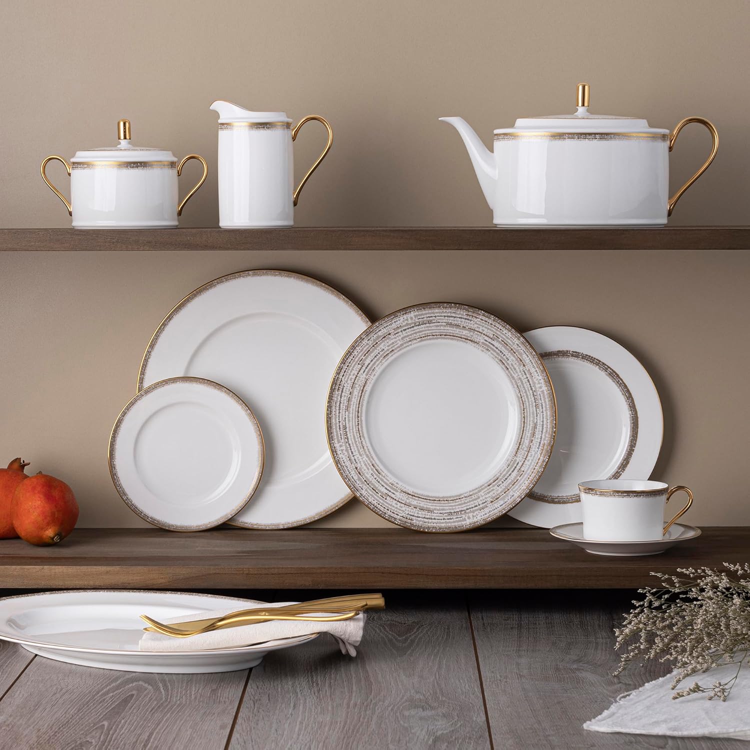 Haku features traditional gold banding, paired with a super-modern blurred edge featuring mixed metals on fine bone china. With a name derived from a Japanese proverb, Haku is designed to add value and joy to your meals. Haku offers place setting components as well as an array of serving pieces and accessories. Haku is suitable for everyday use and is dishwasher safe!