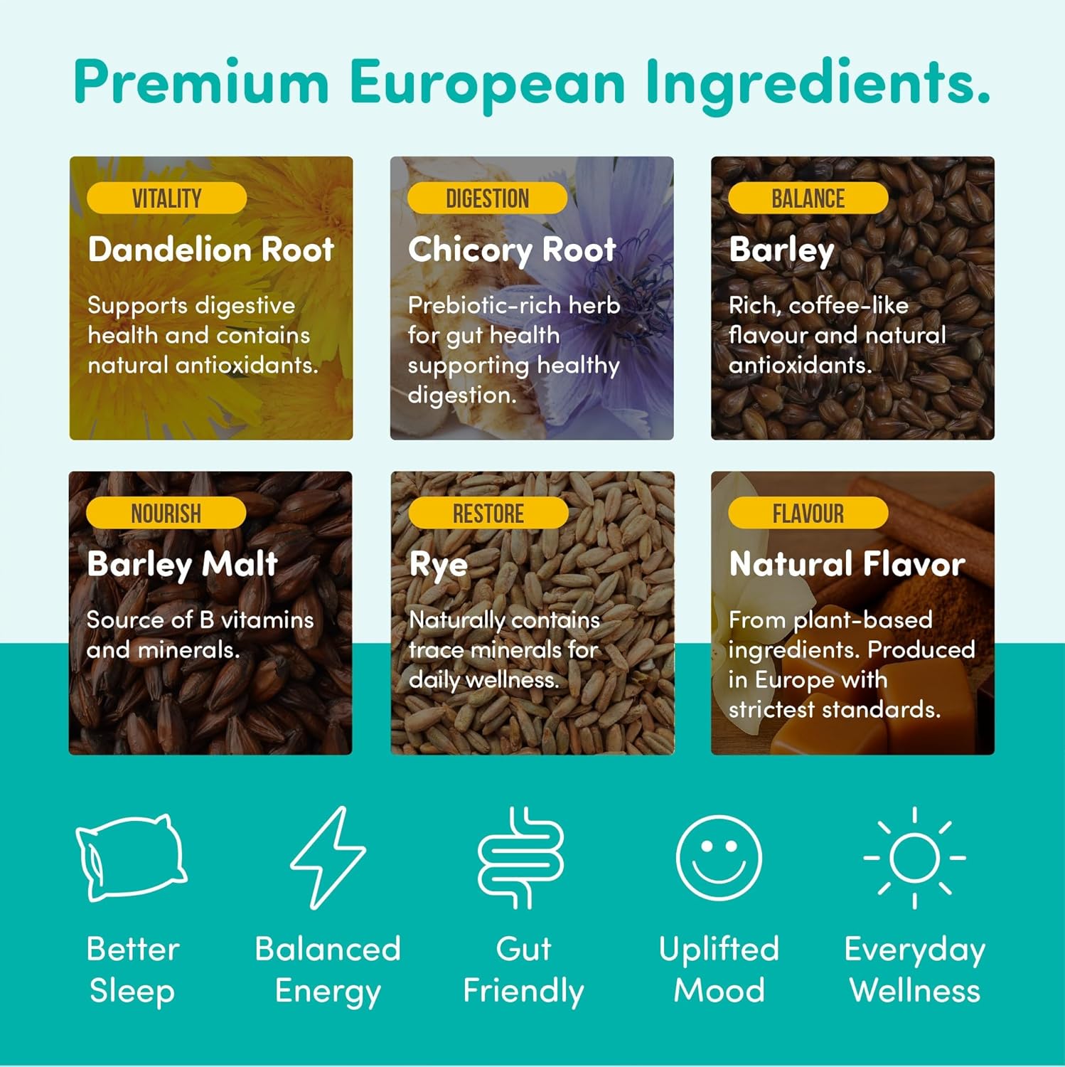 | Special Ingredients | Dandelion root extract, chicory root extract, barley extract, rye extract |