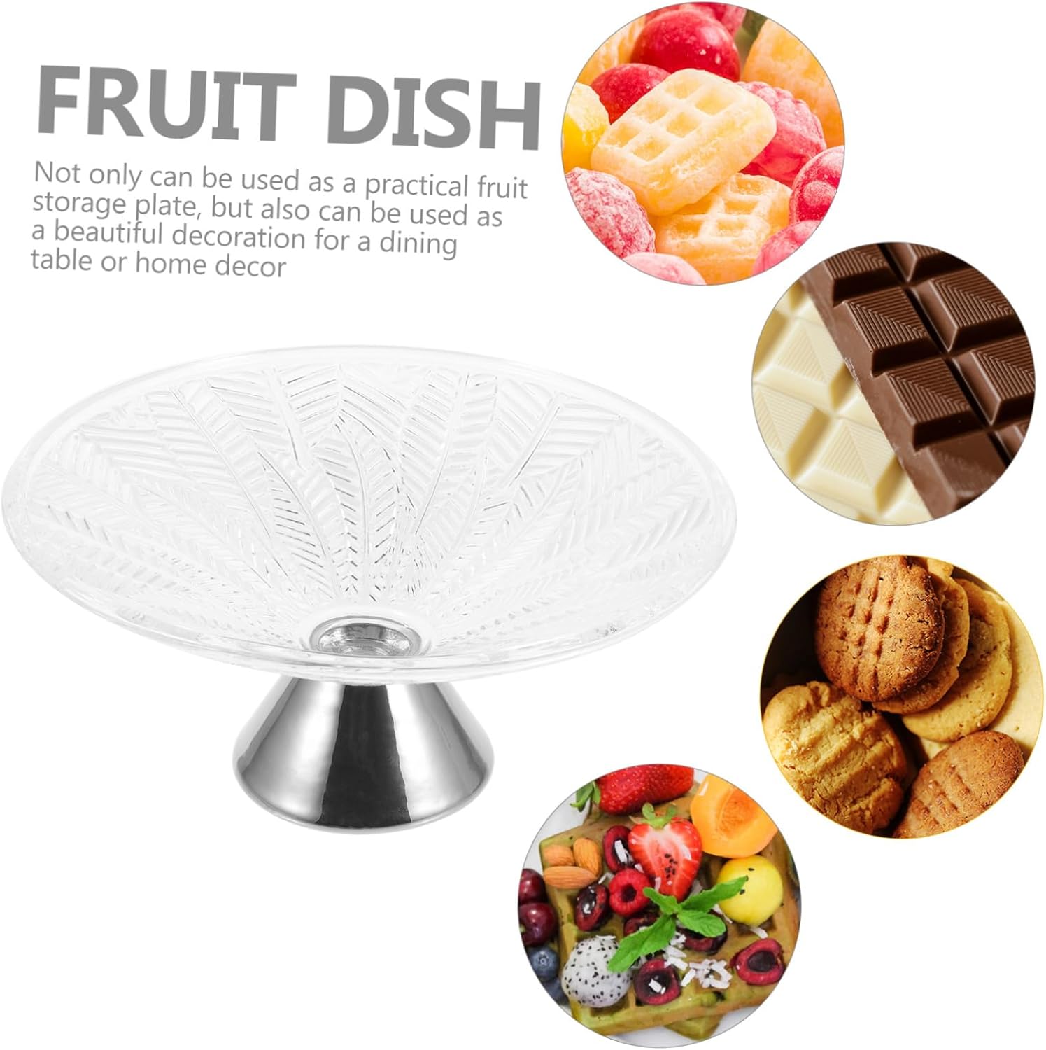 Package List 1 x Fruit Bowl Features -Color:Silver fruit bowl -Material:Ceramic, Glass small decorative fruit bowl -Product Info:Leaf Glass Fruit Tray -Size:25.00X25.00X11.50cm/9.82X9.82X4.52in fruit bowl decorative -The fruit dish is made of stable ceramic, glass material, which is wear-resistant and , and is not easy to be damaged. footed candy plate -High base design, adding a luxurious, vintage and elegant feel to your kitchen, counter, office, living room, etc european style fruit bowl. -Suitable for different places, such as home, restaurant, hotel, bar and other places, bring you convenience glass fruit plate. -Not only can be used as a practical fruit storage plate, but also can be used as a beautiful decoration for a dining table or home decor fruit serving plate. -This delicate snack bowl has large opening design and good ventilation to keep fruit clean and fresh decorative fruit bowls for table.Goods Descriptioncreative fruit plate Uses ceramic and glass material, this Fruit Bowl is lightweight and .fruit tray Good-looking and modern style, proper for sharing dried fruit or snacks with guests during leisure time or at parties and share more fun.fruit platter The candy tray can be used to keep a variety of snacks with the large capacity design
