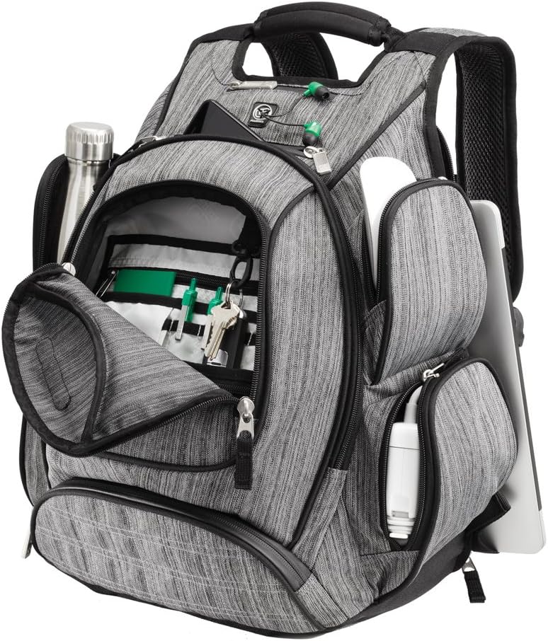 *Made of 420D dobby poly/600D poly *Back panel side-entry padded laptop pocket *Large center storage area *Power cord and mouse storage *Internal file sleeve *Weatherproof fleece-lined digital media/audio pockets with headphone exit port *Adjustable sternum strap *Deluxe organization panel *Laptop sleeve: 15.5"h x 11.5"w x 2"d; fits most 17" laptops *Dimensions: 18"h x 13.5"w x 9"d