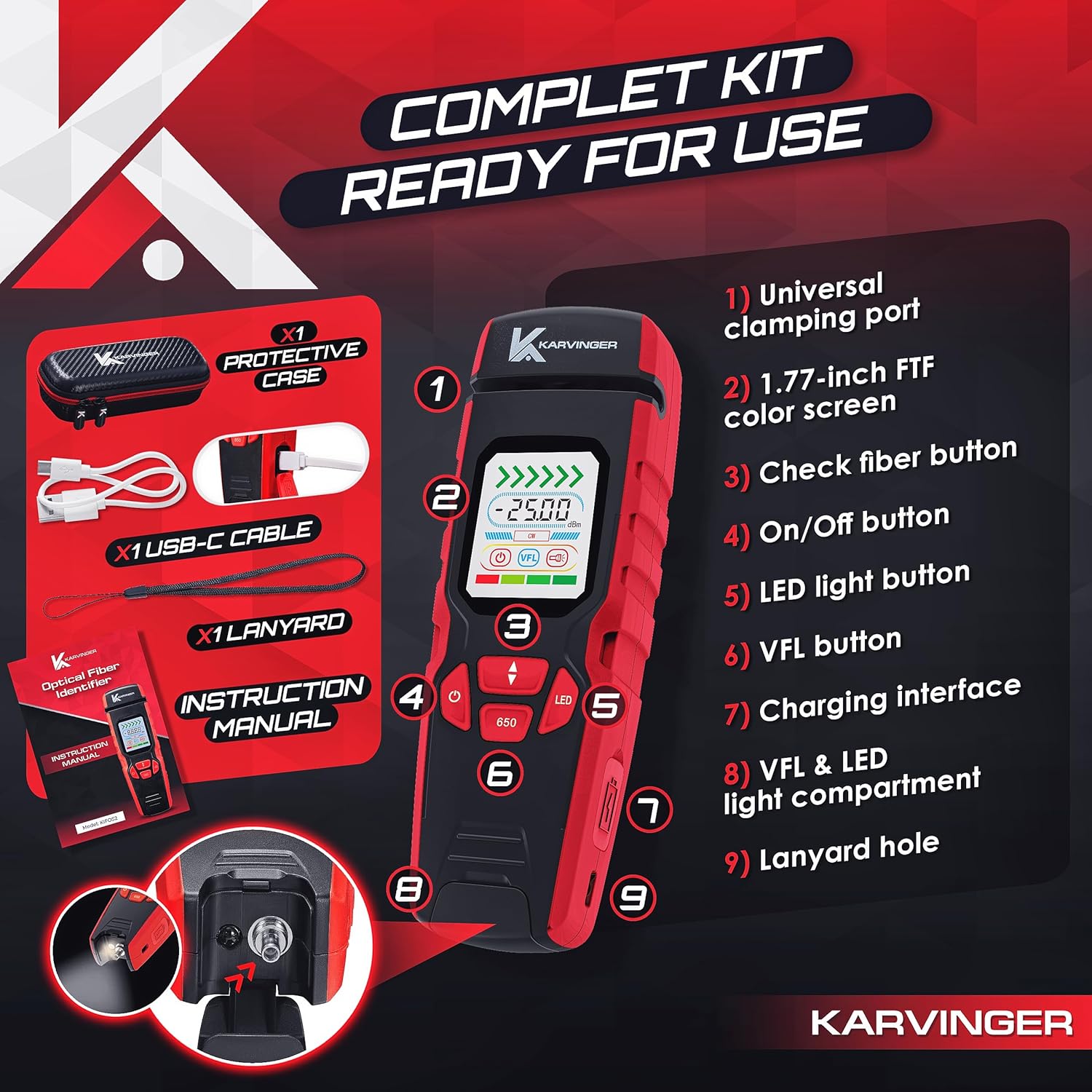 Transform Your Fiber Optic Testing with Professional-Grade PrecisionThe KIFOS2 Optical Fiber Identifier represents the next generation in fiber optic testing technology. Featuring our innovative EasyClamp system, this professional-grade tool eliminates the guesswork from fiber identification and testing.Professional Features: ✓ Advanced micro-bending technology for non-destructive testing ✓ Motorized EasyClamp system for consistent results ✓ Broad wavelength detection (850-1700nm) ✓ Multiple frequency recognition (CW, 270Hz, 1kHz, 2kHz) ✓ Built-in Visual Fault Locator (VFL)Universal Compatibility: Works seamlessly with all standard fiber types: 0.25mm bare fiber, 0.9mm, 2.0mm, and 3.0mm pigtails. No adapter changes required.Complete Professional Kit Includes: Premium carbon fiber carrying case USB charging cable Professional lanyard Comprehensive user manualBacked by our 12-month warranty and professional technical support, the KIFOS2 is the reliable choice for fiber optic professionals who demand precision and efficiency in their daily operations.