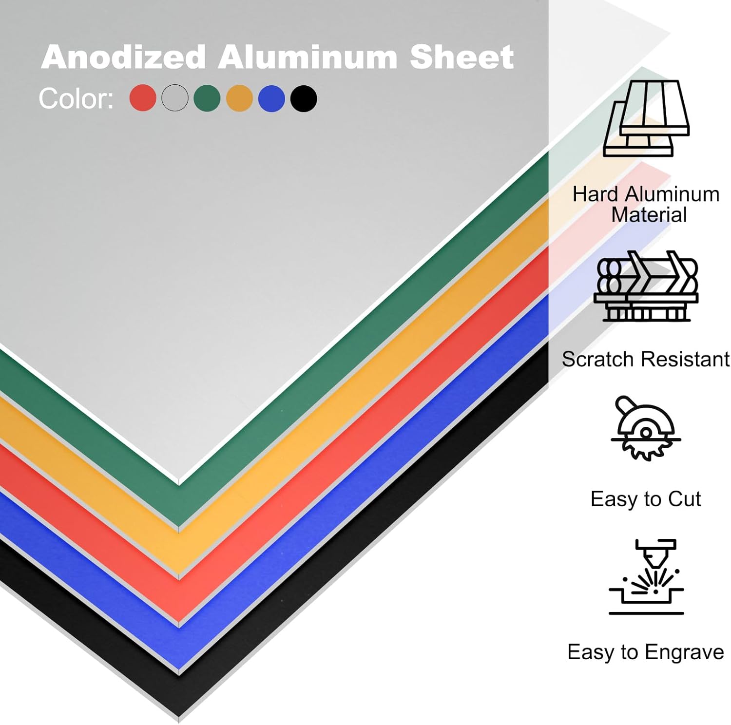 Anodized aluminum sheet is widely used in mechanical parts, architectural decoration, household handicrafts, automobile parts decoration, aerospace equipment, power transmission iron frames, ship equipment hardware, etc. By laser engraving, it can be designed for signs, badges, metal plaques, trophies, business cards, label plates, etc.SpecificationMaterial: AluminumColor: Black, Grey, Blue, Yellow, Red, GreenSize(LxWxT): 178x127x0.8mm (7x5x1/32inch)Package List: 6 x Anodized Aluminum Sheet (Each Color 1 PCS)AdvantageMade of quality aluminum material, the anodized aluminum sheet is preservative, hard, sturdy, and not easy to deform. It has a smooth surface and good scratch resistance after oxidation treatment without cracks or holes, does not easily adhere to dust, is easy to clean even if dirty, perfect for precise processing. Easy to cut and engrave, use professional machines to easily design personalized engraving items.InstructionUse a professional laser printer to engrave the desired patterns and information. It can be designed for gift signs, signs for commercial buildings, interior decoration supplies, advertising boards, mailbox address and message plates, etc.NOTE1. The front of the anodized aluminum sheet has an anti-scratch layer, please take off it before use.2. Please take personal protective measures when designing engraved items.