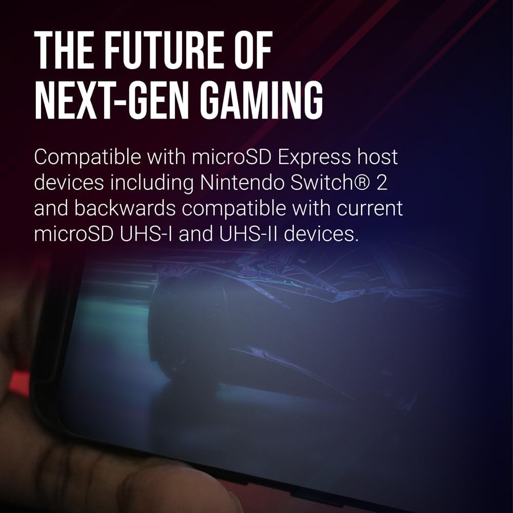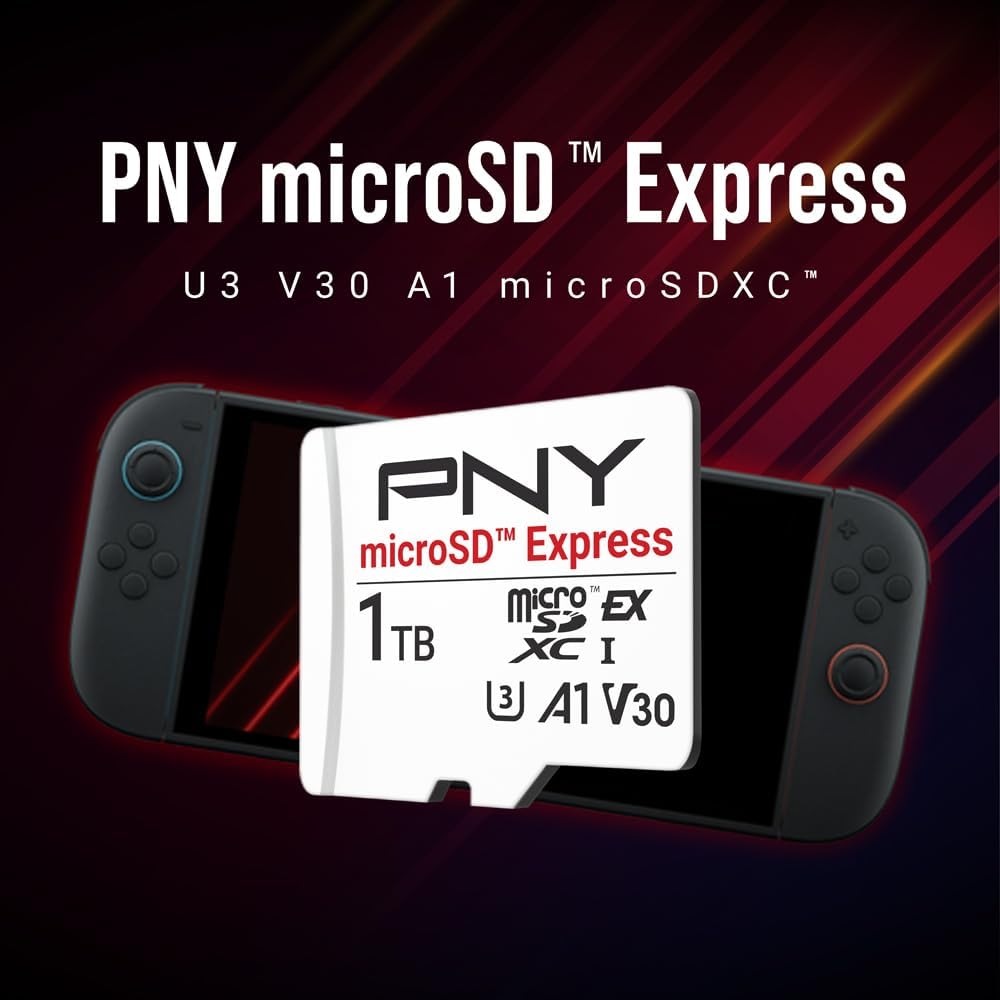 Immerse yourself in the evolution of gaming with PNY microSD Express U3 V30 A1 flash memory cards - delivering top-tier performance and next-level gameplay! Engineered with next-generation microSD technology, these cards achieve extreme speeds up to 890MB/s Read and up to 850MB/s Write, reducing load times to start gaming faster and explore immersive worlds with extreme resolution. PNY microSD Express cards are up to 4.4x faster than standard microSD UHS-I cards, enabling lightning-fast downloads and smoother gaming experience. Upgrade to revolutionary PCIe Gen 3x1 microSD Express technology, ideal for superspeed microSD Express host devices, including Nintendo Switch® 2. More than double your Nintendo Switch® 2’s capacity with up to 1TB of expanded storage - ideal for housing your growing library of AAA titles. Meticulously engineered to keep up high performance, PNY microSD Express is crafted to stay cool under pressure with unique heat dissipation designs maximizing cooling efficiencies. Backed by a limited lifetime warranty and maximum durability for gaming on the go. A1 Application Performance allows users to run gaming apps directly from the microSD card, and experience faster app launches - so you can spend less time waiting and more time playing!¹,²,³,⁴Disclaimers: ¹For Flash Media Devices, 1 megabyte = 1 million bytes; 1 gigabyte = 1 billion bytes. Actual useable capacity may vary. Some of the listed capacity is used for formatting and other functions, and thus is not available for data storage. ²Up to 890MB/s read speed, up to 850MB/s write speed. Requires compatible host device capable of reaching such speeds. Performance and photo/video support (eg, "full HD") may vary depending on the host devices, user’s settings and configurations. ³Based on internal and external testing. Results may vary based on user conditions, for details see https://www.pny.com/Durability-Flash-Cards. PNY warranty terms and conditions apply. ⁴For full details visit www.pny.com