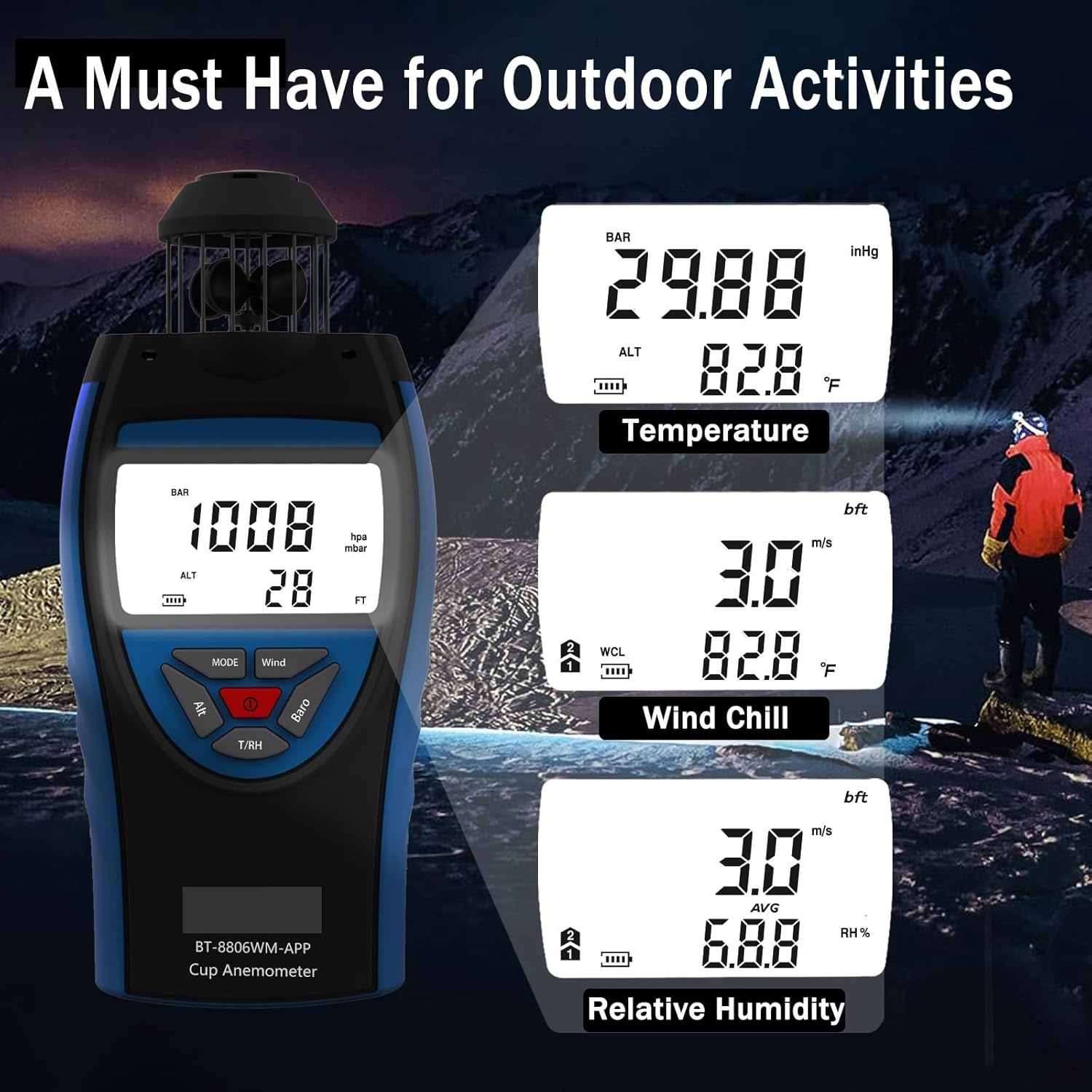 Wind Speed GaugesPortable Anemometer With Compass, Measurement Of Atmospheric Pressure, Dew Point, And Altitude, Cup Wind Speed Tester InstrumentWith its capability, this device allows for convenient data transmission to your mobile device, enabling real-time analysis and sharing of data through the dedicated app. The anemometer is equipped with a clear backlit display, making it easy to read measurements even in dimly lit conditions. Its intuitive interface includes unit selection for atmospheric pressure (inHg and mbar) and altitude (meters and feet), allowing you to customize the settings based on your requirements.Designed for both functionality and convenience, includes features such as low battery indicator, automatic/manual shutdown, and a build to withstand various environmental conditions. This device is an ideal tool for meteorologists, outdoor enthusiasts, and anyone needing reliable environmental data.Product Point:Comprehensive Wind Measurement: Measures current, maximum, minimum, and average wind speeds in multiple units (m/s, ft/min, knots, km/h, mph) with high accuracy.Multi-Parameter Environmental Sensor: Capable of measuring atmospheric pressure, temperature, humidity, dew point, wind chill, and altitude, providing a complete environmental analysis. Connectivity: Seamlessly transmits data to your smartphone, allowing for real-time monitoring and data recording through the mobile app.User-Friendly Design: Features a backlit for easy reading in low-light conditions, low battery indicator, and both automatic and manual shutdown options.Versatile and Portable: Lightweight (150g with batteries) and powered by two 1.5V AAA batteries, making it easy to carry and use in various environments.Product Parameter:==========Battery Included : NoHigh-concerned chemical : NoneType : AnemometerModel Number : BT-8806-WM-APPCertification : Wind Speed Range1 : 0.7 to 42 m/sWind Speed Range2 : 137.8 to 82680.5 ft/minWind Speed Range3 : 1.4 to 81.6 knotsWind Speed Range4 : 2.5 to 151 km/hWind Speed Range5 : 1.6 to 94 mphTemperature Accuracy : ±2 (±3.6)