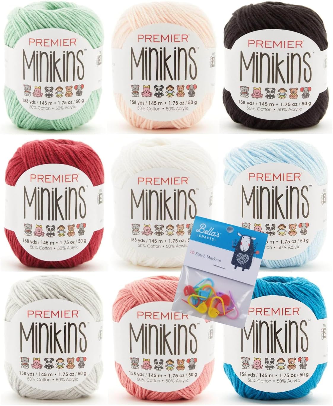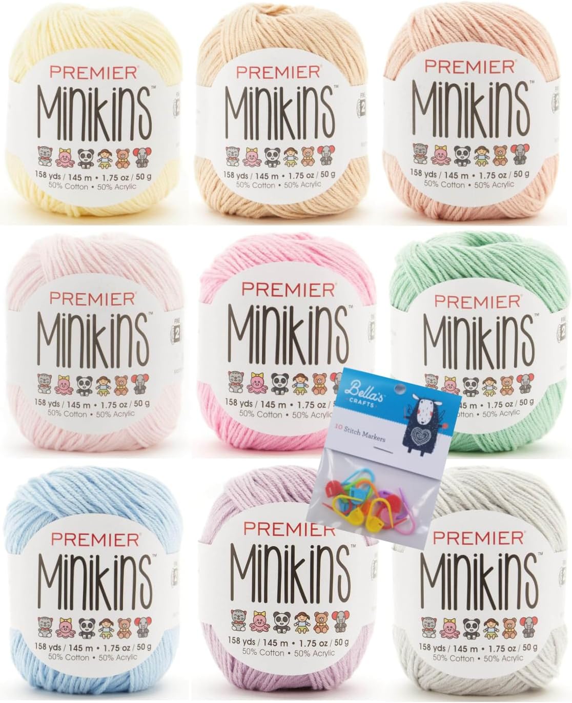 Who says good things don’t come in small packages! These adorable 50 gram balls from Premier Yarns are perfect for the crafter in your life. The cool comfort of cotton and the light bounce of acrylic make for a perfect year-round yarn. The tight twist gives great stitch definition in projects that won’t sag out of shape. The ideal yarn for amigurumi, granny squares or crafts where only small amounts per color are needed. Combine several mini skeins for colorful baby blankets, shawls, hats, scarves, and more. Available in 42 colors. Conveniently bundled into color coordinated packs of 9 with Bella's Crafts stitch markers for added cost savings.