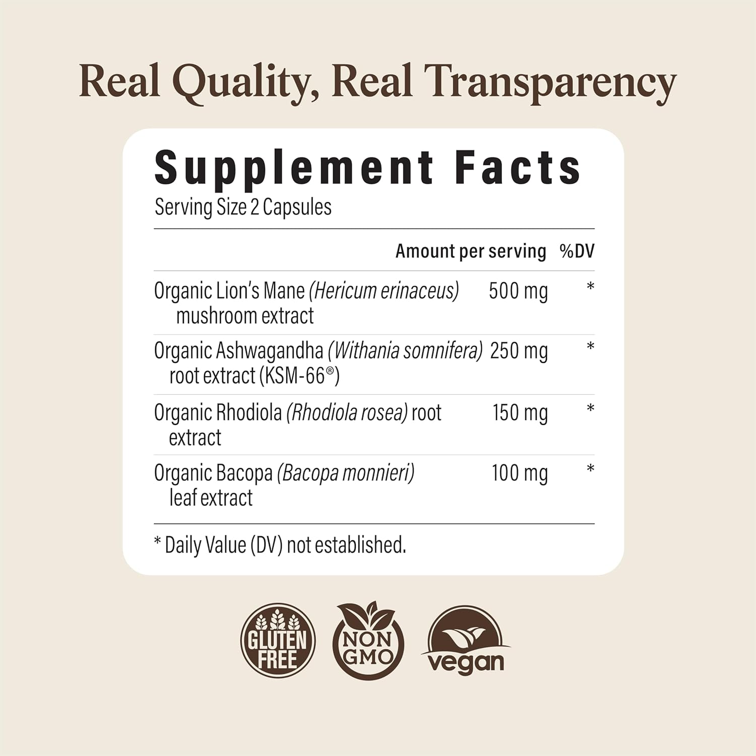 | Special Ingredients | KSM-66 Ashwagandha, Organic Lion's Mane Mushrooms |