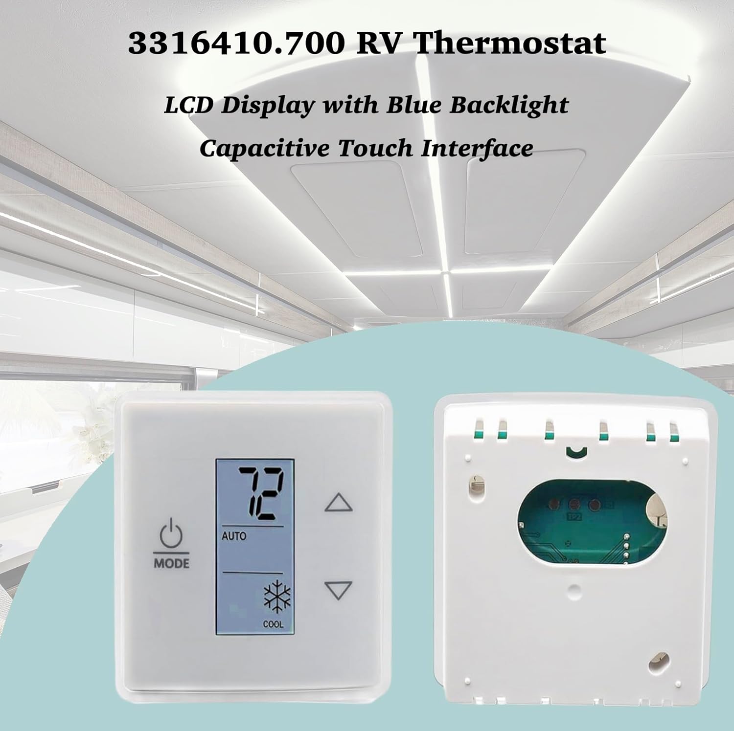 RV Thermostat Kit, Fit for Dometic RV Furnace, Single Zone LCD Touch RV Thermostat Heat/Cool Control Kit, 12V DC Camper Air Conditioner Wall Thermostat Replaces 3316230.000 3316410.700Note: This RV Thermostat CANNOT control a furnace without a Dometic A/C in the system.RV thermostat replaces part# 3316230.000, 3316410.700 (thermostat); package includes thermostat (3316410.700), control box (3313191.000), and hardware, for installation in RV camper trailer for single zone control of heat/coolRV thermostat kit is intended for air conditioner series 540 4579 4595 640, fit for Dometic A/C models 457915, 459516, 459530, 540315, 540316, 640310, 640310C, 640312, 640315, 640315C, 640316, 640316C, B57915, B59516, B59530, B79516, H540315, H540316Camper thermostat features an LCD display with blue backlight for easy readability; capacitive touch interface for intuitive and easy temperature, speed and mode adjustmentsControl box features a built-in stable circuit board for reliable operation, and dustproof enclosure for longer service life, coming with plug wires and hardware for straightforward installationPACKAGE1 x RV Thermostat1 x Control Box1 x Hardware